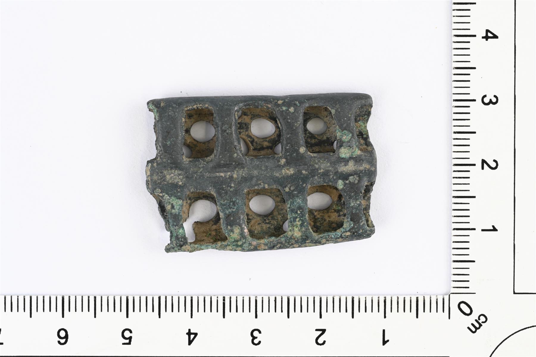 | Suorakaiteenmuotoinen kasettihela. Etupuolella on koristeluna kolmiomaisia ja vinoneliömäisiä reikäkuvioita. Taustapuolella on puhkonainen levy. Keskiosa on umpinainen, joten helan läpi on pujotettu kaksi ohutta hihnaa. Vrt. Kivikoski Abb. 935 ja 936. | |