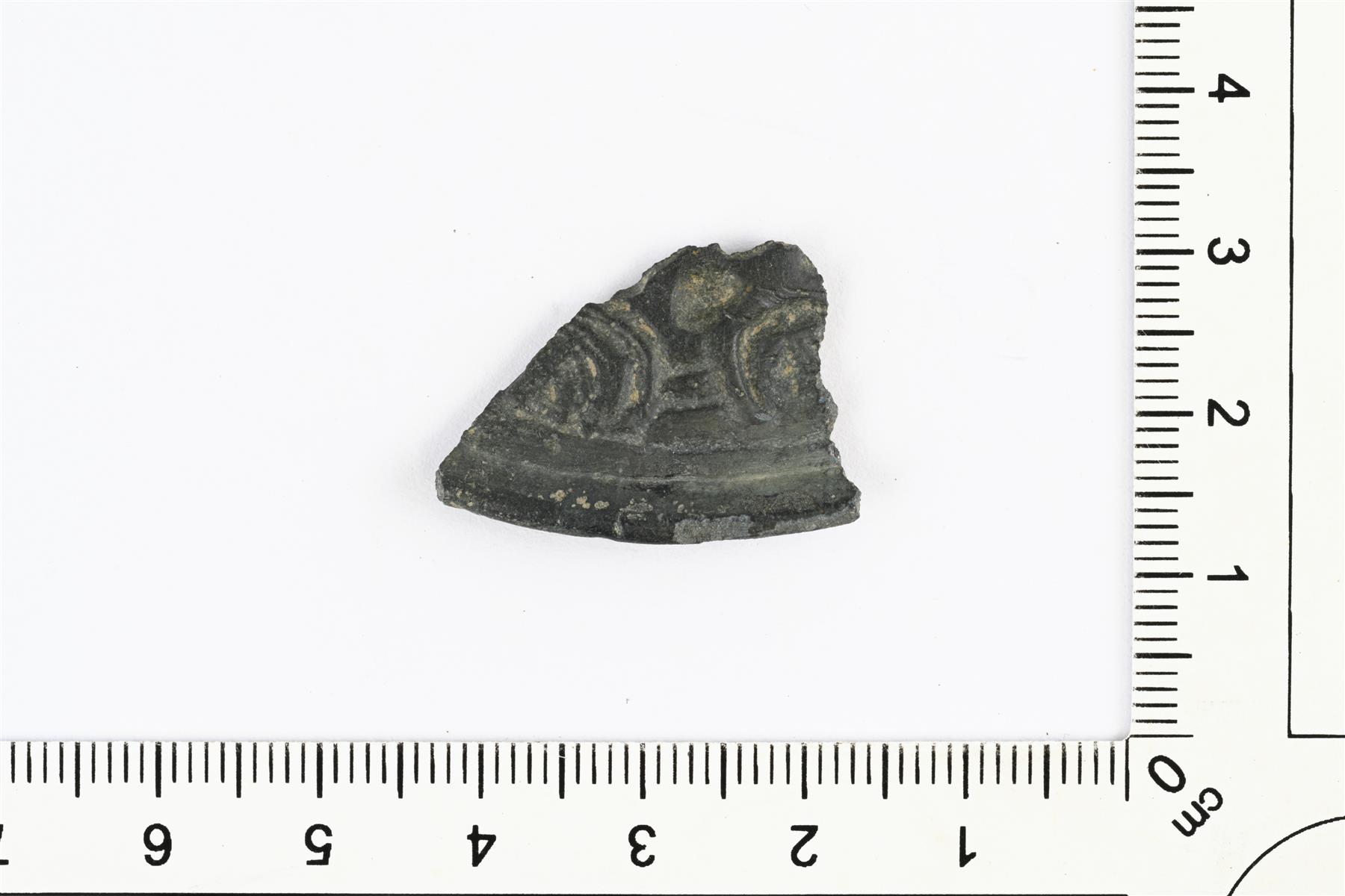 | Soikean kupurasoljen reunakatkelma. Koristeluna reliefikuviointia. Vastaa lähinnä C2-tyypin soikeita kupurasolkia. | |