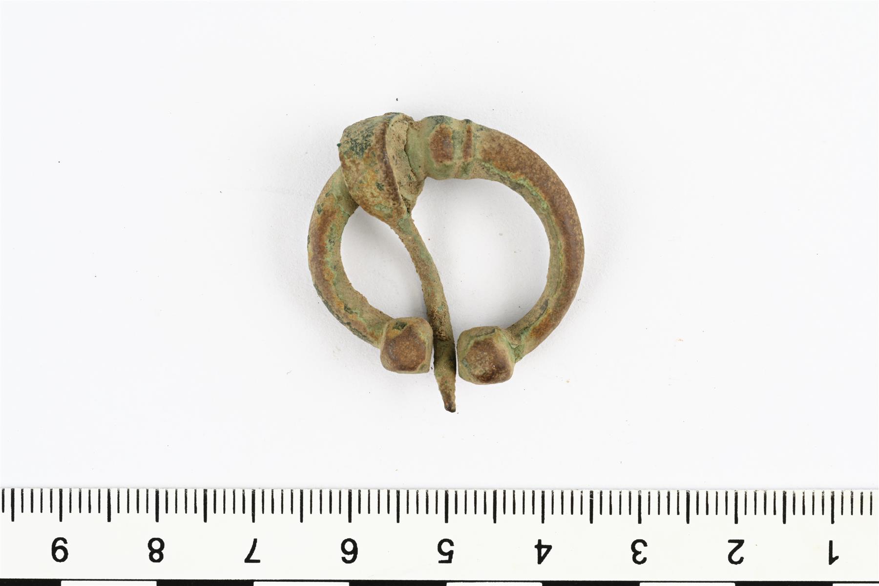 | Pienikokoinen hevosenkenkäsolki. Säilynyt kokonaisena. Kehän keskellä on paksumpi kohovyö. Nupit ovat neliömäiset ja niiden kulmat on fasetoitu. Neula on yksinkertainen ja kierretty kehän ympärille. Vrt. Kivikoski Abb. 1038. | |