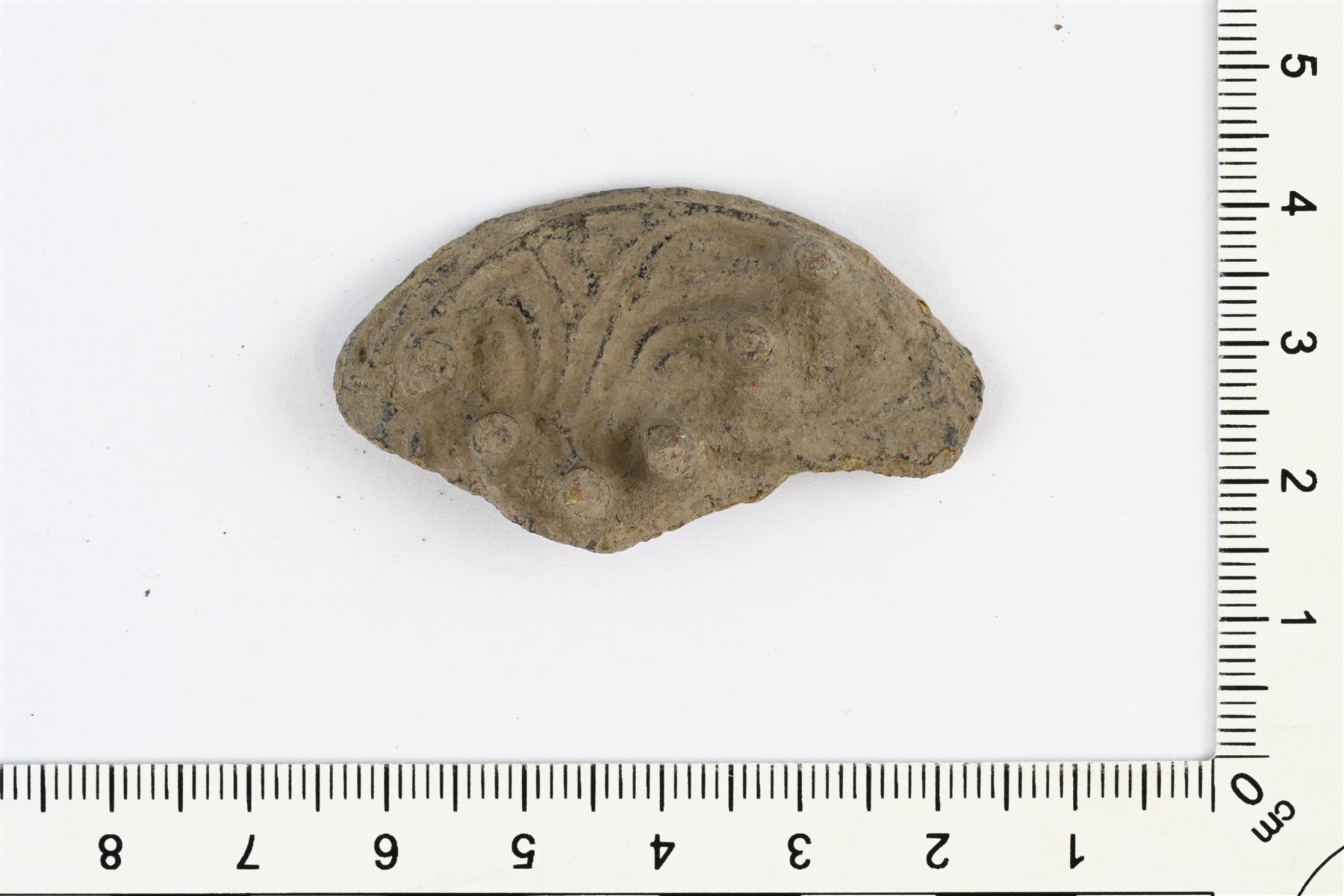 | Pyöreän kupurasoljen reunakatkelma. Koristeluna tappeja ja viivauurteilal tehtyjä nauhakäärmeitä. Taustapuolella on säilyneenä jousilaitteen kiinnityslenkin tyviosa. | |