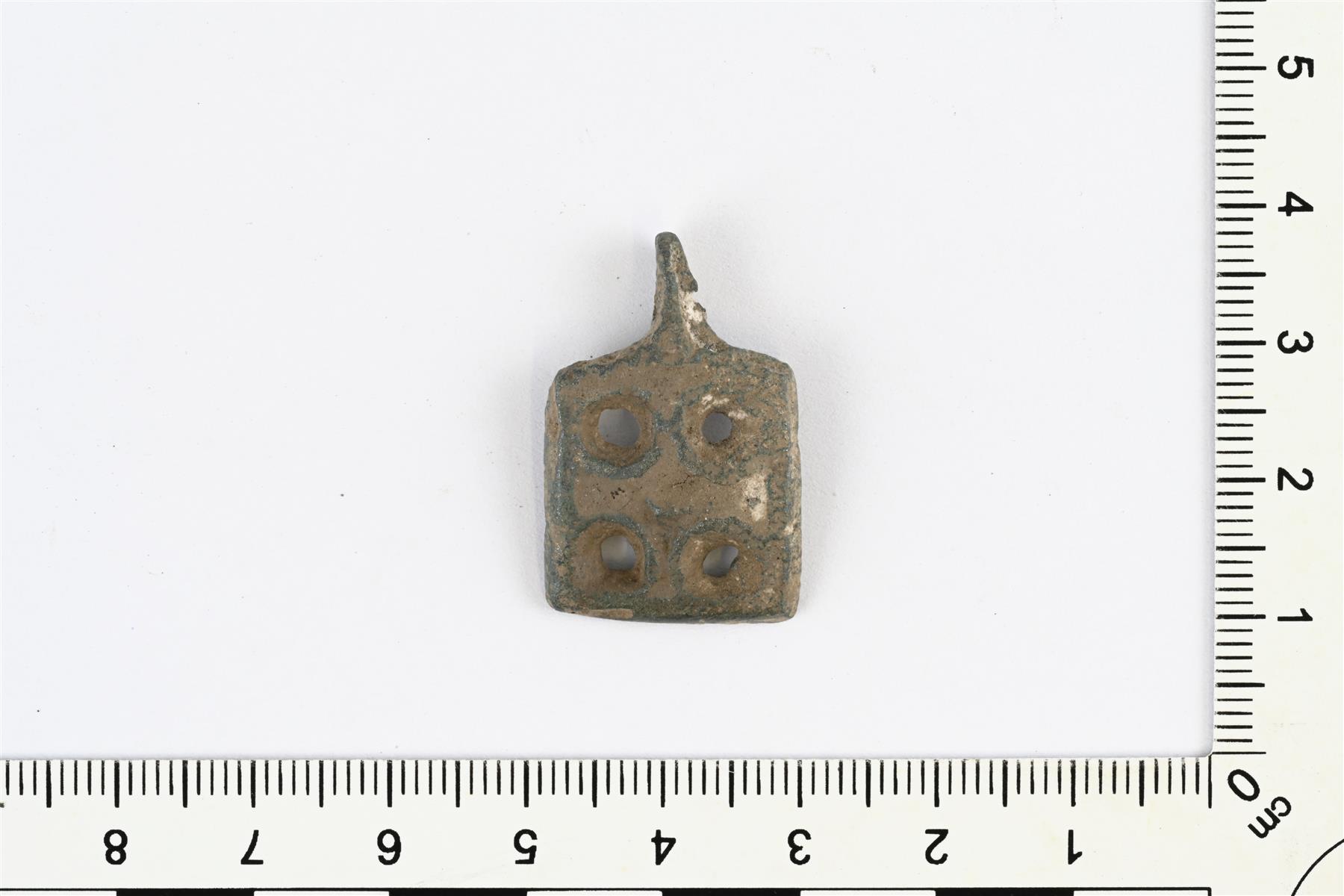 | Neliönmuotoinen riipus tai ripustettu vyön koristehela. Koristeluna neljä reikää. Valinsauma on osin säilynyt. | |