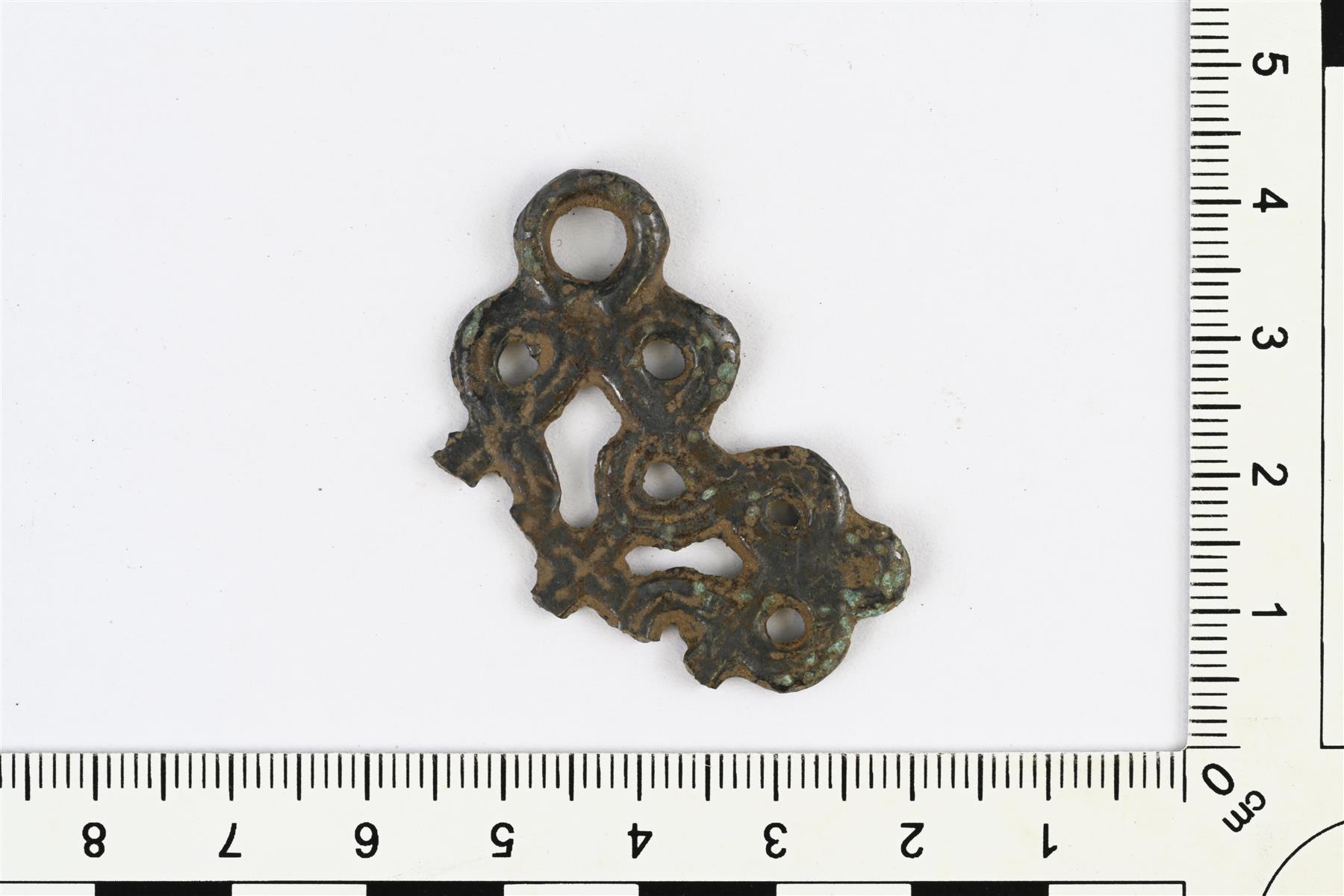 | Ristinmuotoisen ketjunkantajan katkelma. Koristeltu nauhapunontaisella ornamentiikalla. jonka keskellä kulkee ohut viivauurre. Vrt. Kivikoski Abb. 1114. | |
