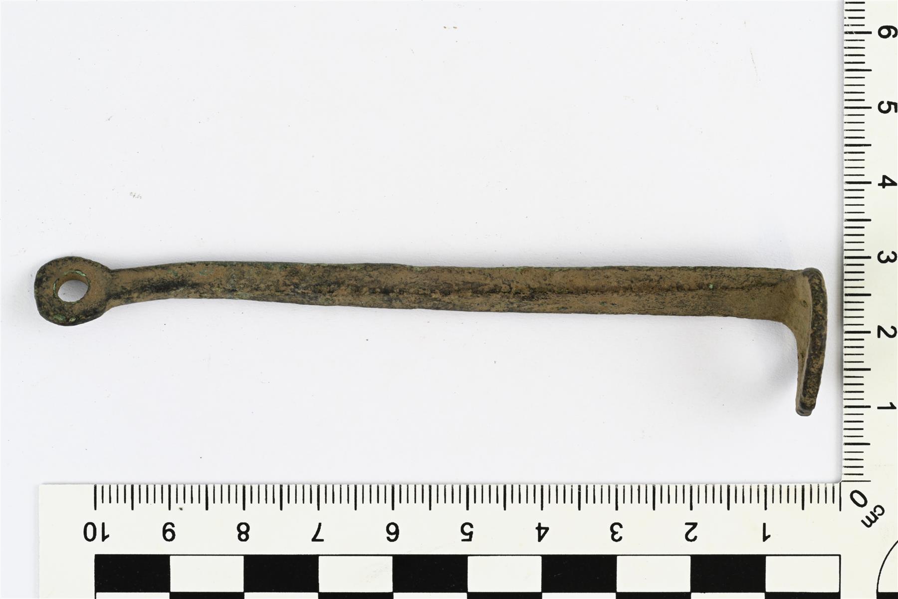 | Kokonaisena säilynyt putkilukon avain. Pää on taivutettu alaspäin ja sen keskellä on suorakaiteenmuotoinen reikä. Varsi on poikkileikkaukseltaan alaspäin kapeneva suorakaide. Päädyssä on ripustuslenkki. | |