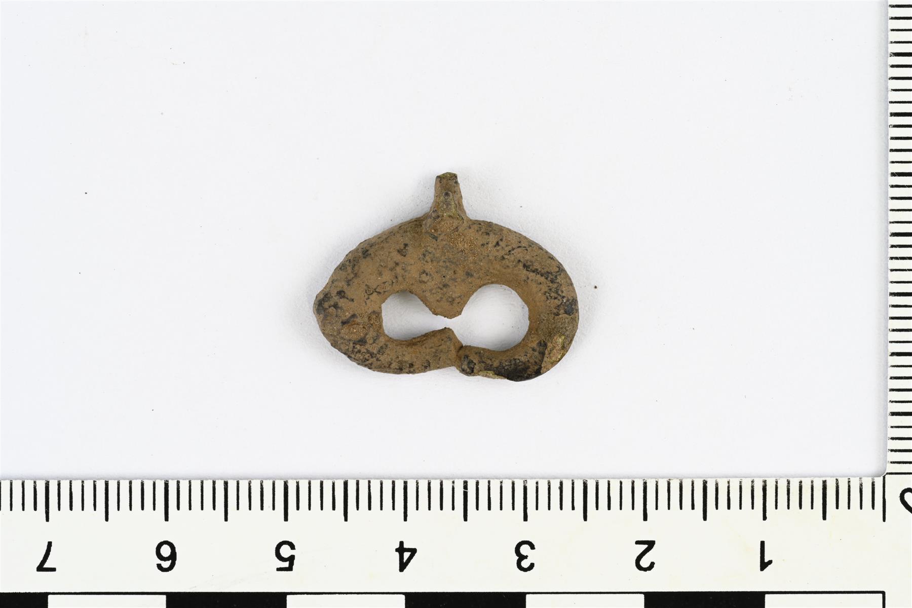 | Lähes kokonaisena säilynyt lunulariipus. Ripustuslenkki on hajonnut. Kuunsirpin päät taipuvat alaspäin ja toisiaan vasten. Toisessa päässä erottuu hieman viivauurrekoristelua. Keskellä on kolmiomainen levennys. Vrt. Kivikoski Abb. 808. | |