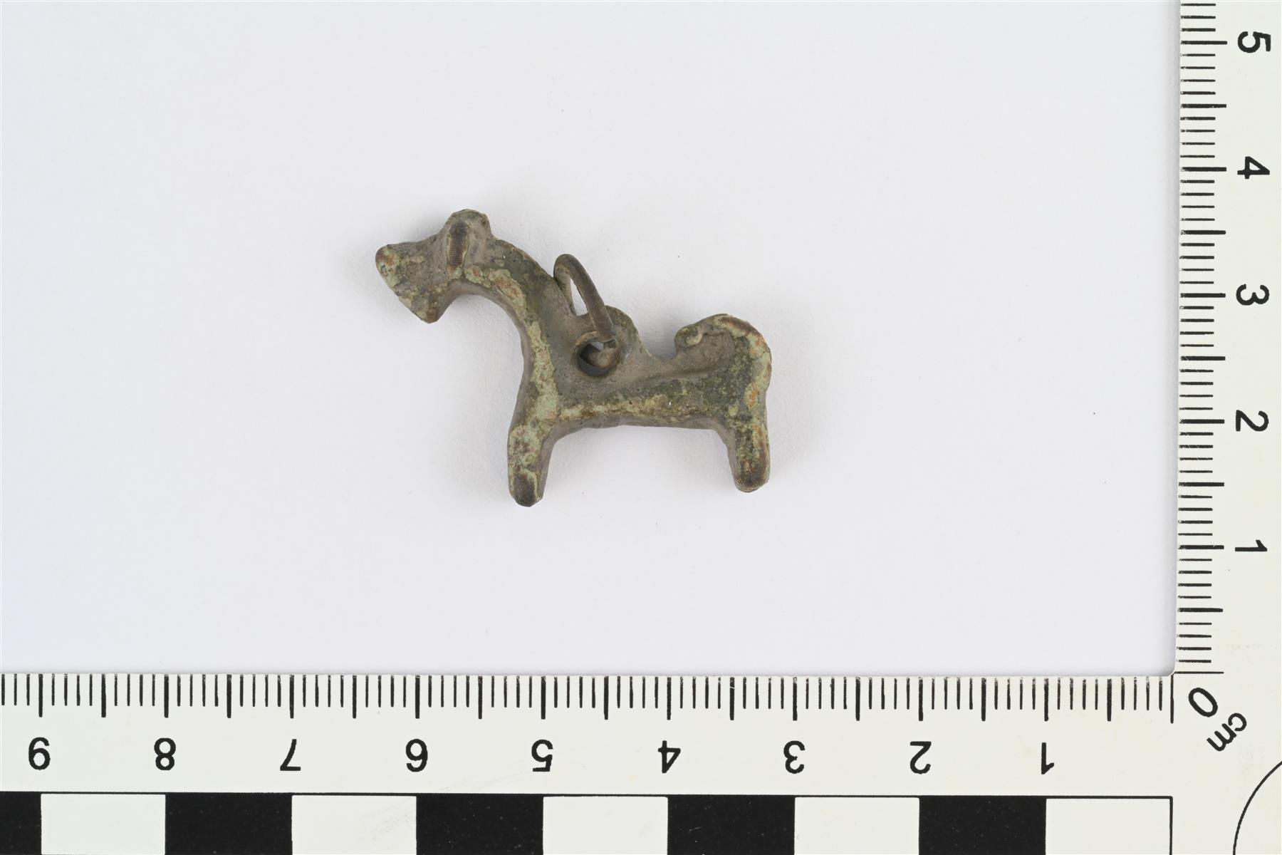 | Plastinen eläinriipus. Nelijalkainen eläin, jolla on pitkä kaartuva kaula ja vartalon päälle kääntyvä häntä. Etu- ja takajalat yhtenä kappaleena, jalat erotettu toisistaan pienellä lovella. Selässä kaulan liitoskohdassa ripustuslenkki, johon liitetty pyöreä avonainen rengas. Muistuttaa muodoltaan punnukseksi tulkittua eläinfiguuria (Kivikoski 1973, Abb. 1162), jossa ei kuitenkaan ole ripustuslenkkiä. | |
