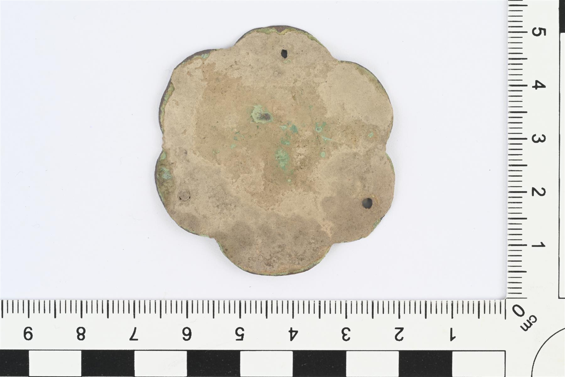 | Kukanmuotoinen litteä hela, luultavasti valjaista. Kukassa kuusi terälehteä, jotka muotoiltu hieman koveriksi / kuperiksi. Kolmessa terälehdessä pieni kiinnitysreikä. | |
