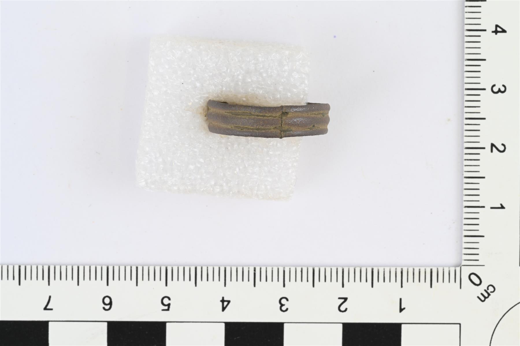 | Tasalevyinen sormus. Ulkopinnalla pitkittäisiä uria. Näkyvä liitoskohta. | |