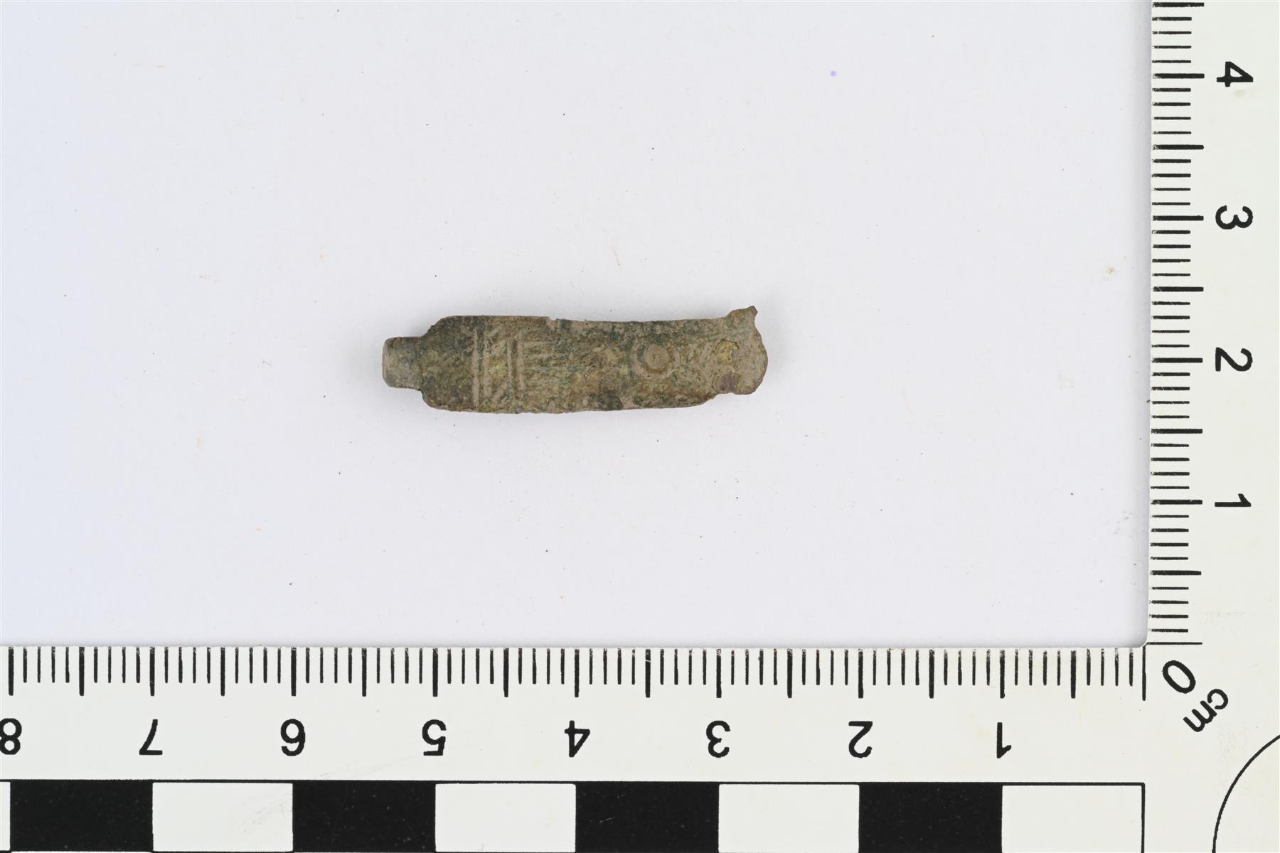 | Kirjansoljen katkelma. Kapea kupariseossuikale, jonka toinen pää taivutettu koukuksi ja toinen murtunut. Etupuolella viivakoristelua. | |