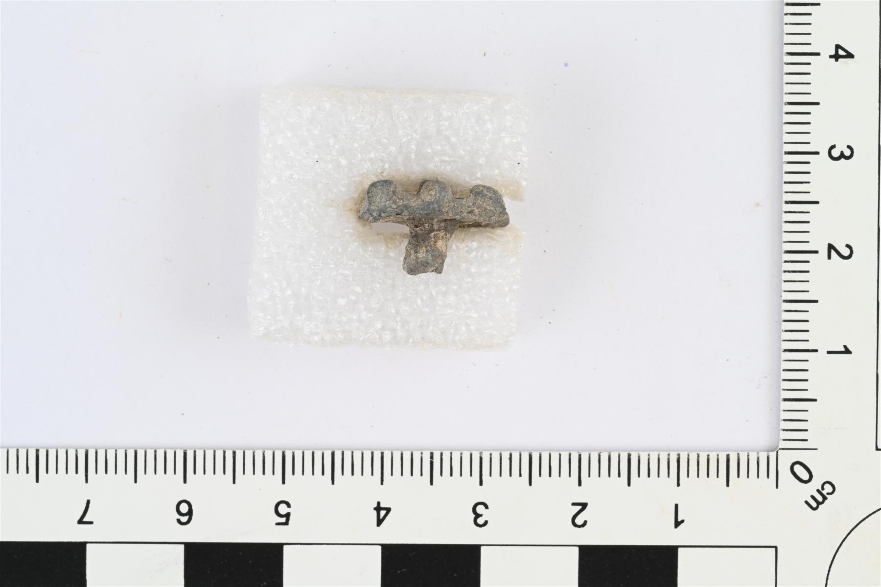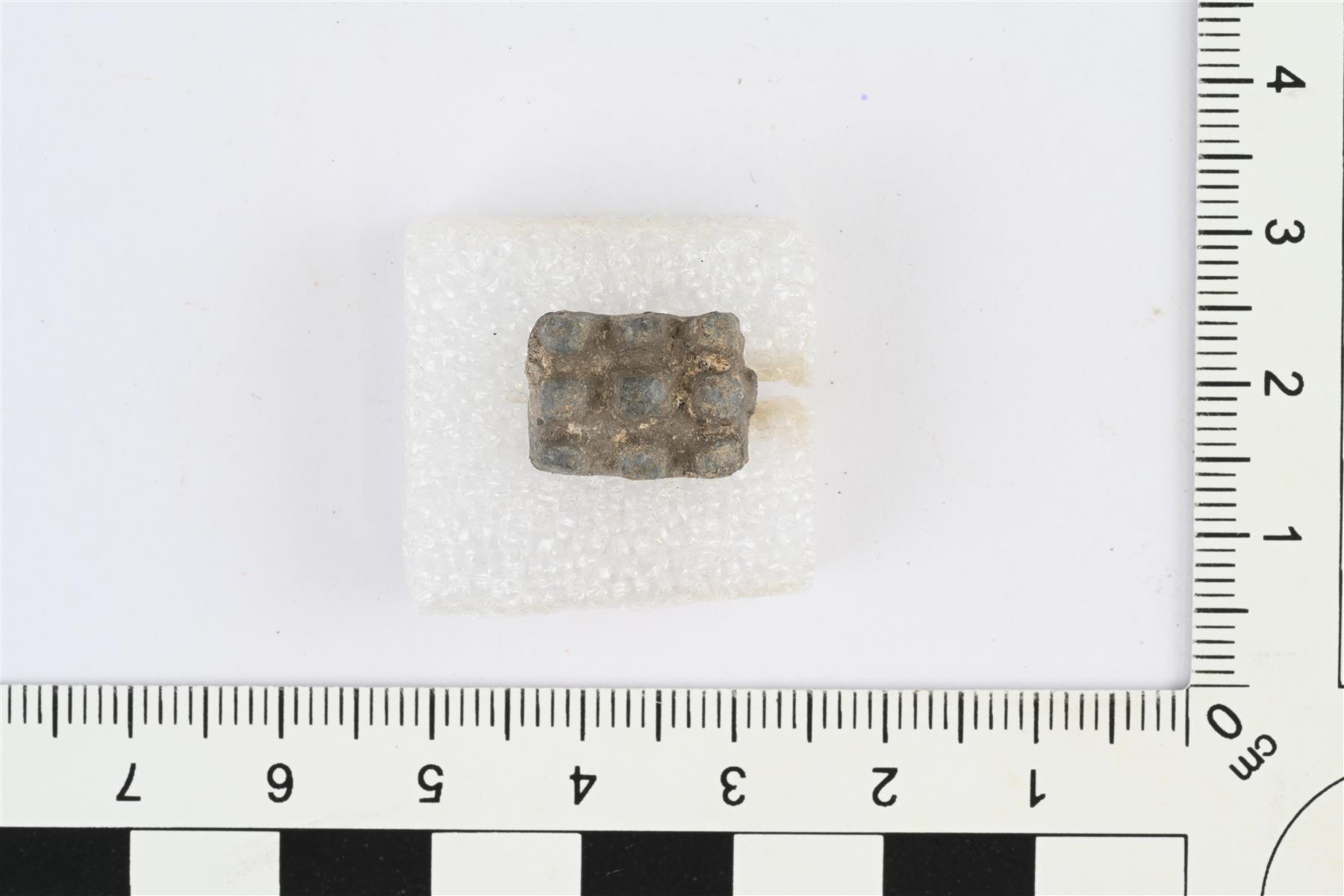| Pieni suorakaiteenmuotoinen vyönhela. Etupuolella kohopalloja kolmessa rivissä. Taustapuolella kiinnitystappi. | |