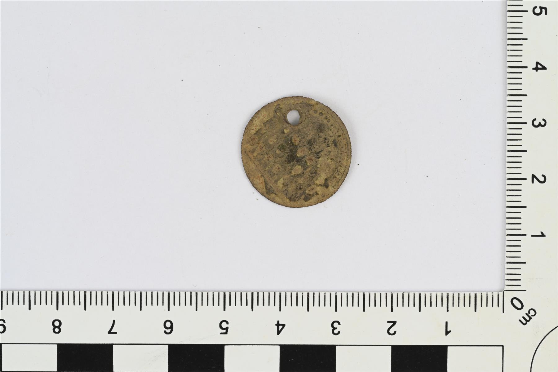 | Yksipuolinen messinkijetoni. Toisella puolella abacus. Mahdollisesti 1700-luku. Rei’itetty. | |