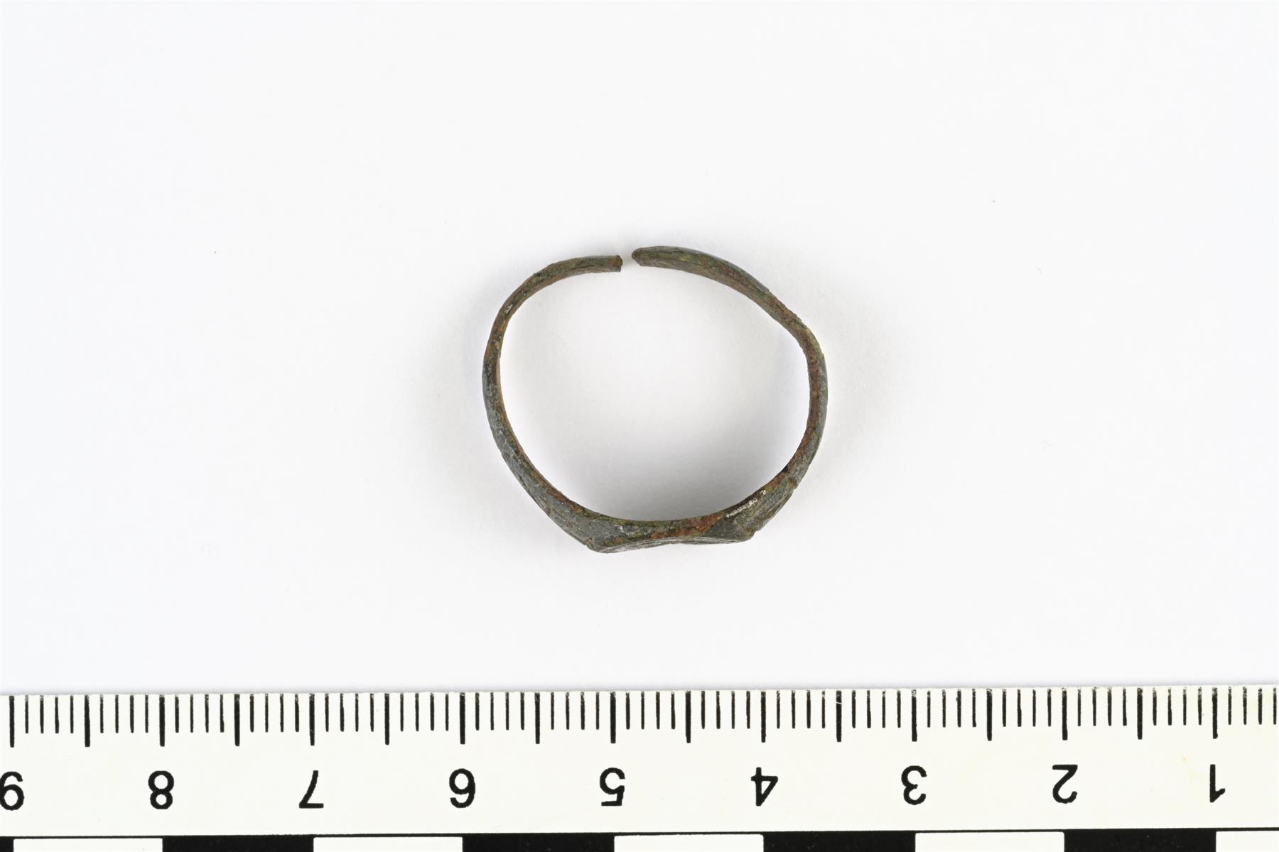 | Sarvas-sormus. Kantaosa on pyöreähkö ja siinä on koristeena viivauurteilla tehty lintukuvio. Kannan kummallakin puolella on yksinkertainen tähtikuvio. Kehä on murtunut auki. | |