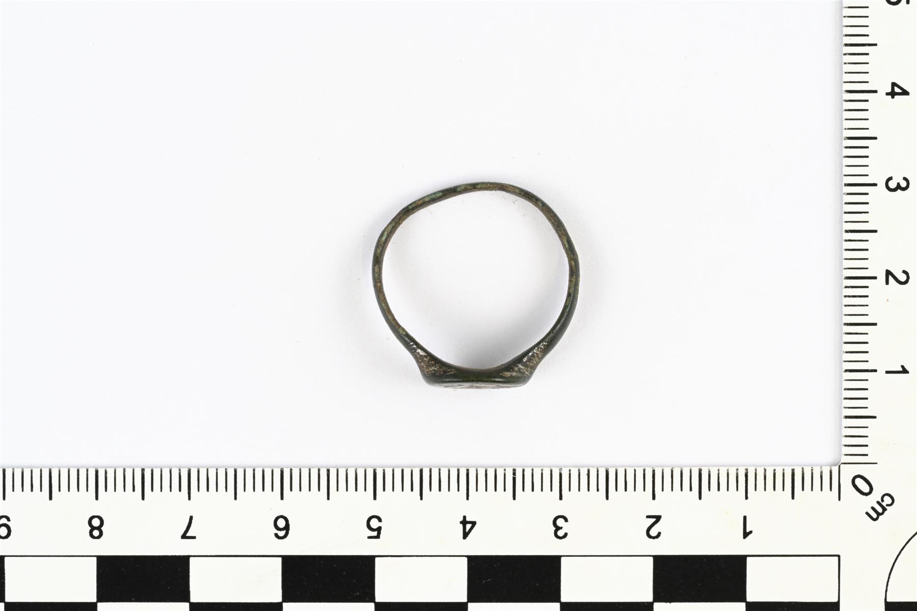| Kokonaisena säilynyt Sarvas-sormus. Kanta on muodoltaan pyöreä ja siinä on kuvattuna viivauurteilla tehty hevonen. | |
