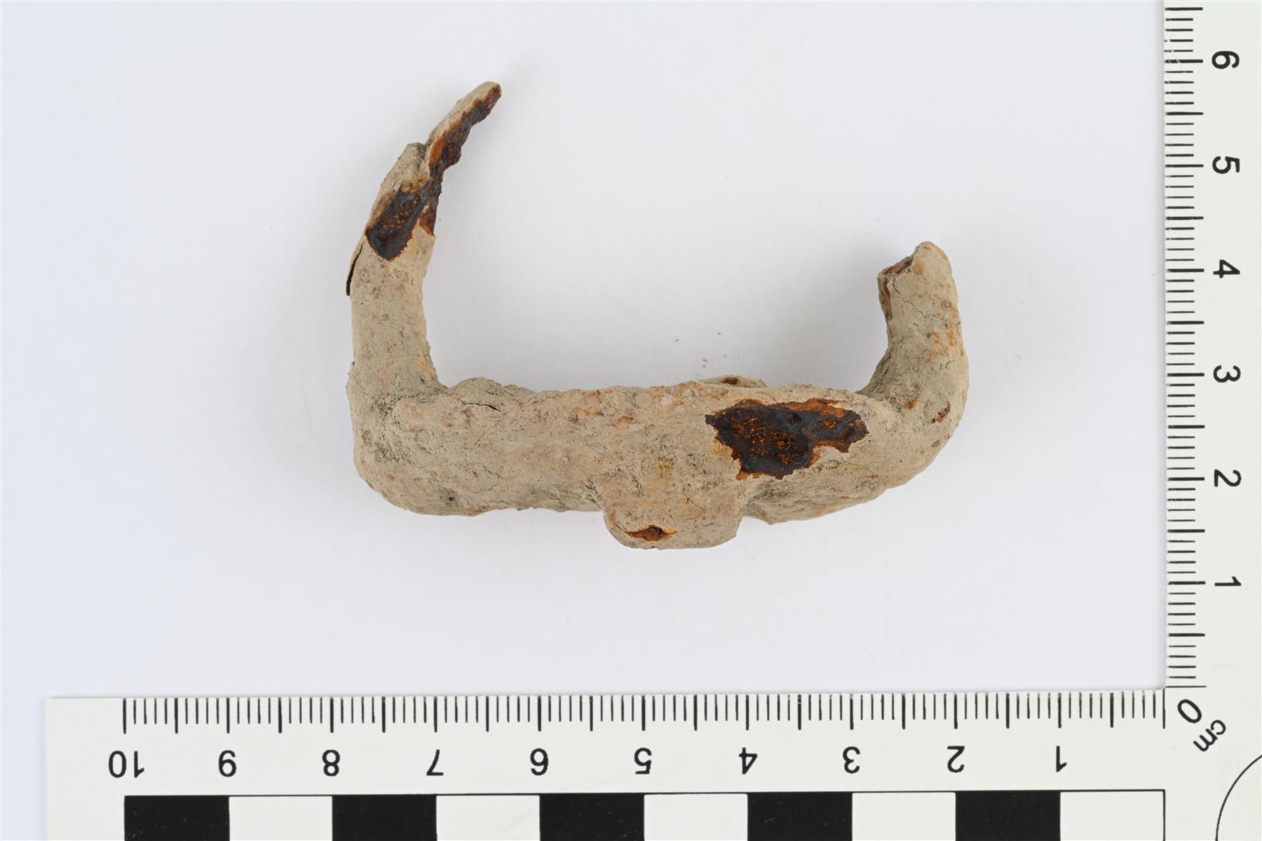 | Kaksipiikkinen hevosen viskari. Soikeahko levy, jonka keskellä toisella puolella kohoava ja suippeneva jäänasta. Levyn toisella puolella sen päissä ohuet taipuvat varret, joista toinen katkennut. Levyn reuna osittain murtunut. Vrt. Kivikoski 1973, Abb. 996. | |