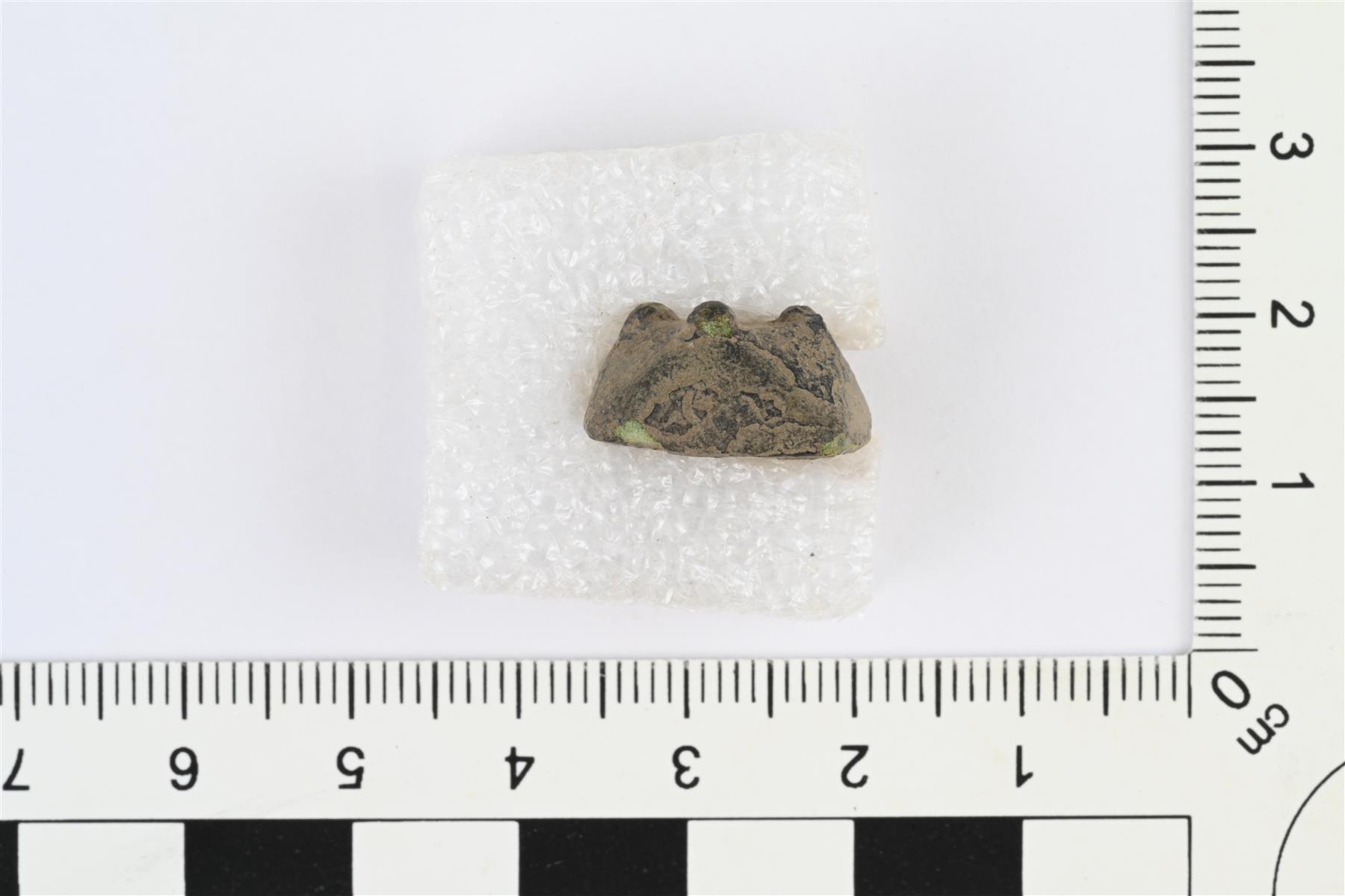 | Hevosenkenkäsoljen tappikoristeinen särmänuppi. Suorakulmion muotoinen, kulmat viistetty niin, että päällinen on vinoneliön muotoinen. Päällä vinoneliön kulmissa tapit ja niiden keskellä häränsilmäleima. | |