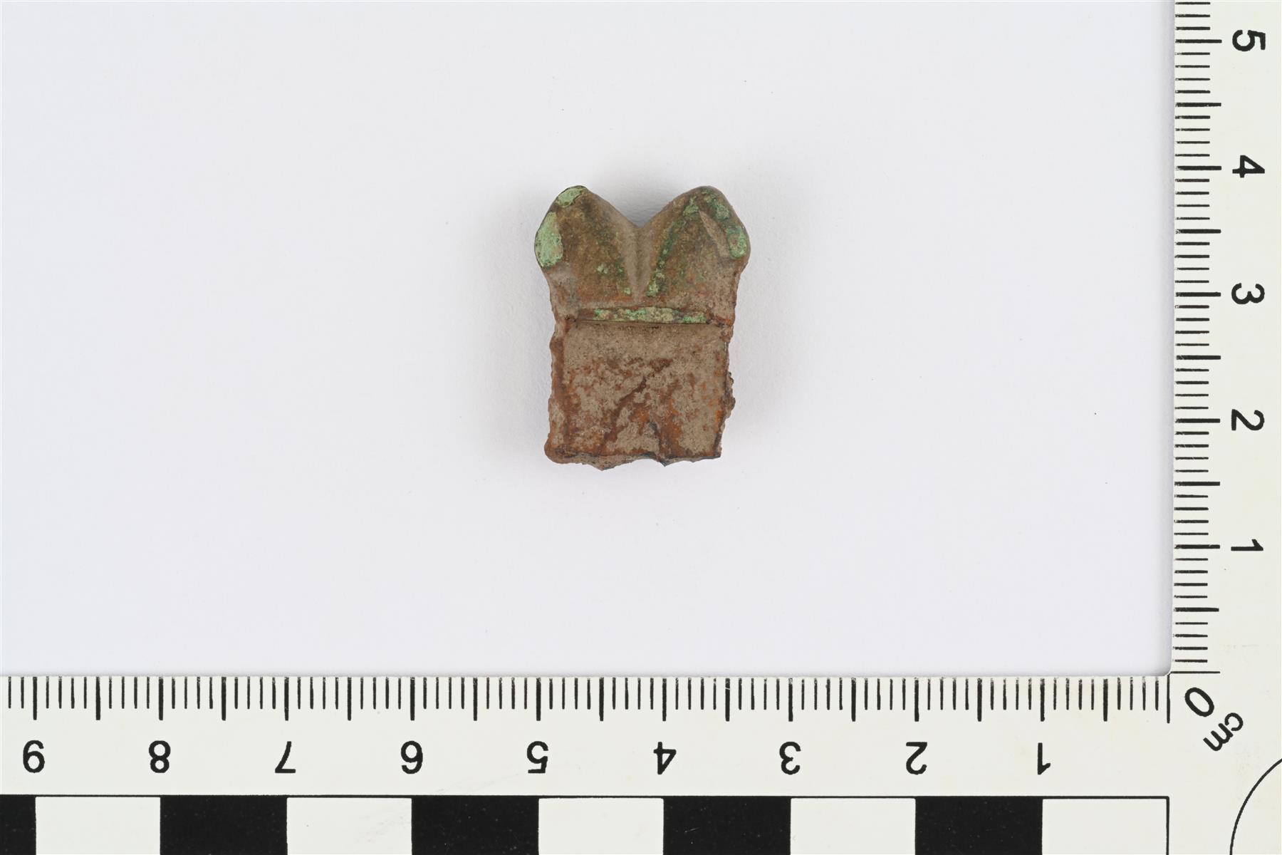 | Pöytäveitsen päätehela. Pääty kaksihaarainen, haarat osoittavat sivuille. Pohjassa kiinni pätkä veitsen rautaista litteää kahvaruotoa. | |