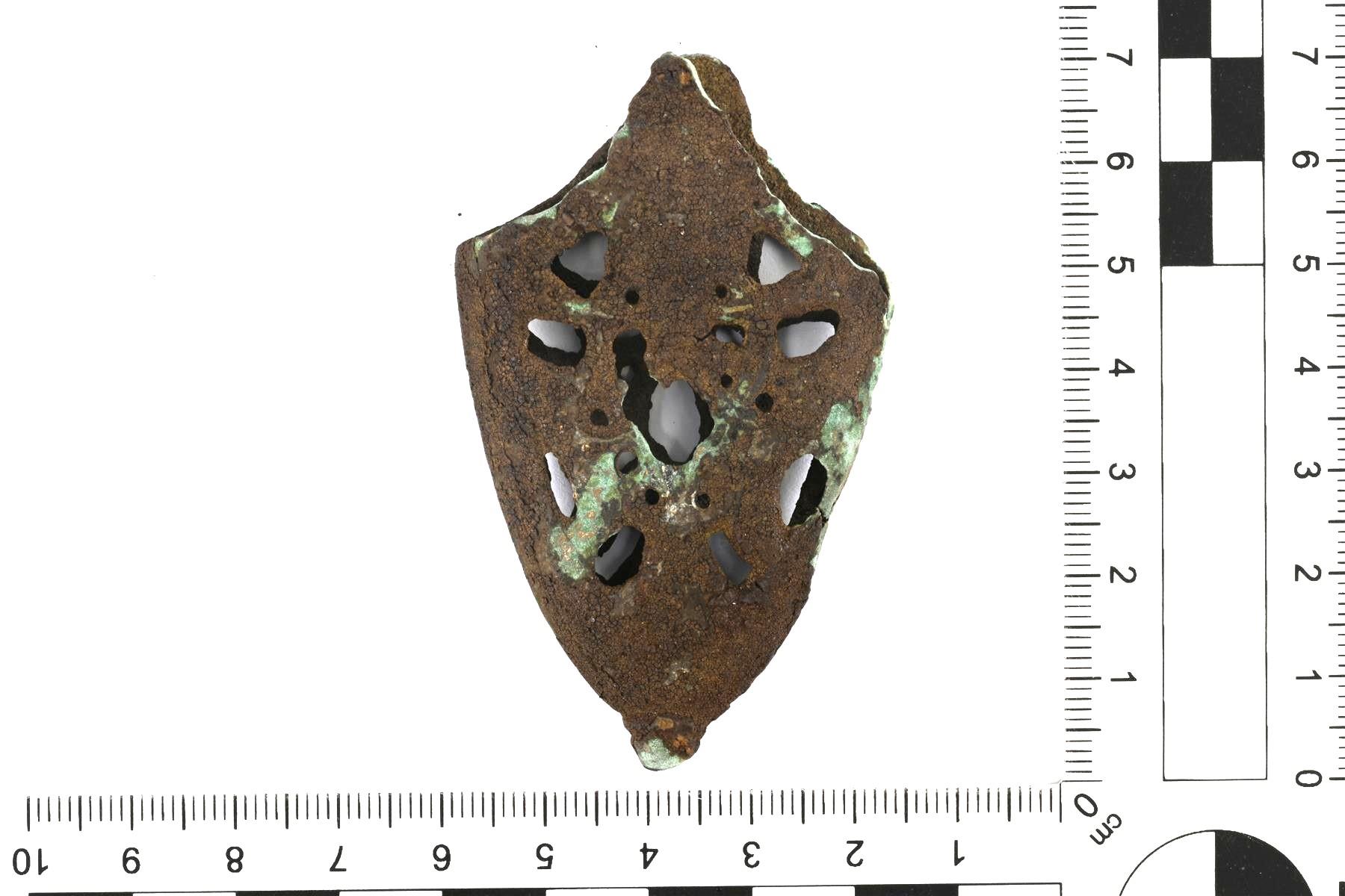 | Lähes kokonaisena säilynyt miekanhuotran kenkäin, ns. Vallebergan tyyppi (Androshchukin tyyppi 3c). Kummallakin puolella on puhkonaisten kuvioiden ja nauhaornamenttien muodostama haukkamainen petolintuaihe. Kenkäimen kärjessä on nappimainen paksunnos. Androschuk 2014: 116, 121. Vrt. KM 40128: 1 | |