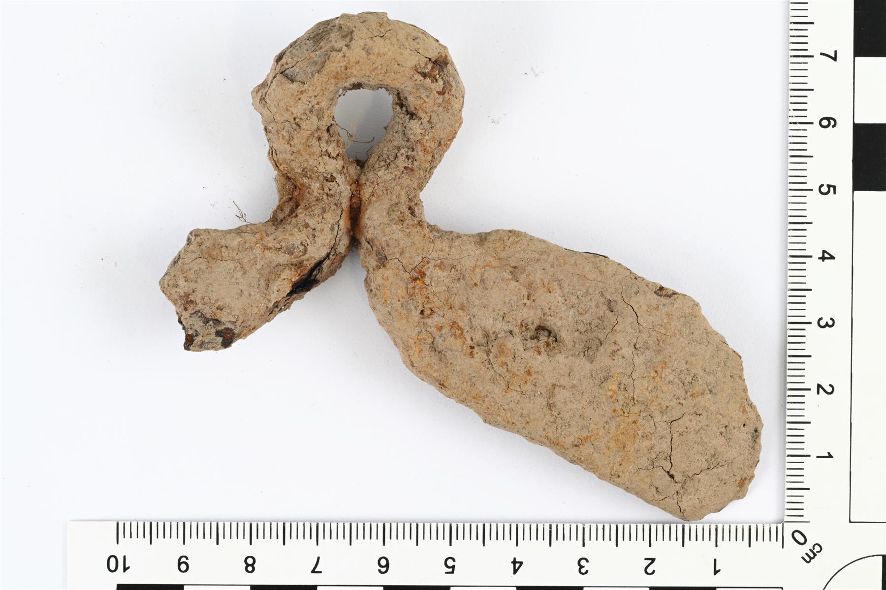 | Rautaisen padan- tai kattilankorvan katkelma. Ehjä pää on lehtimäinen ja siinä on kiinnitystä varten reikä. | |