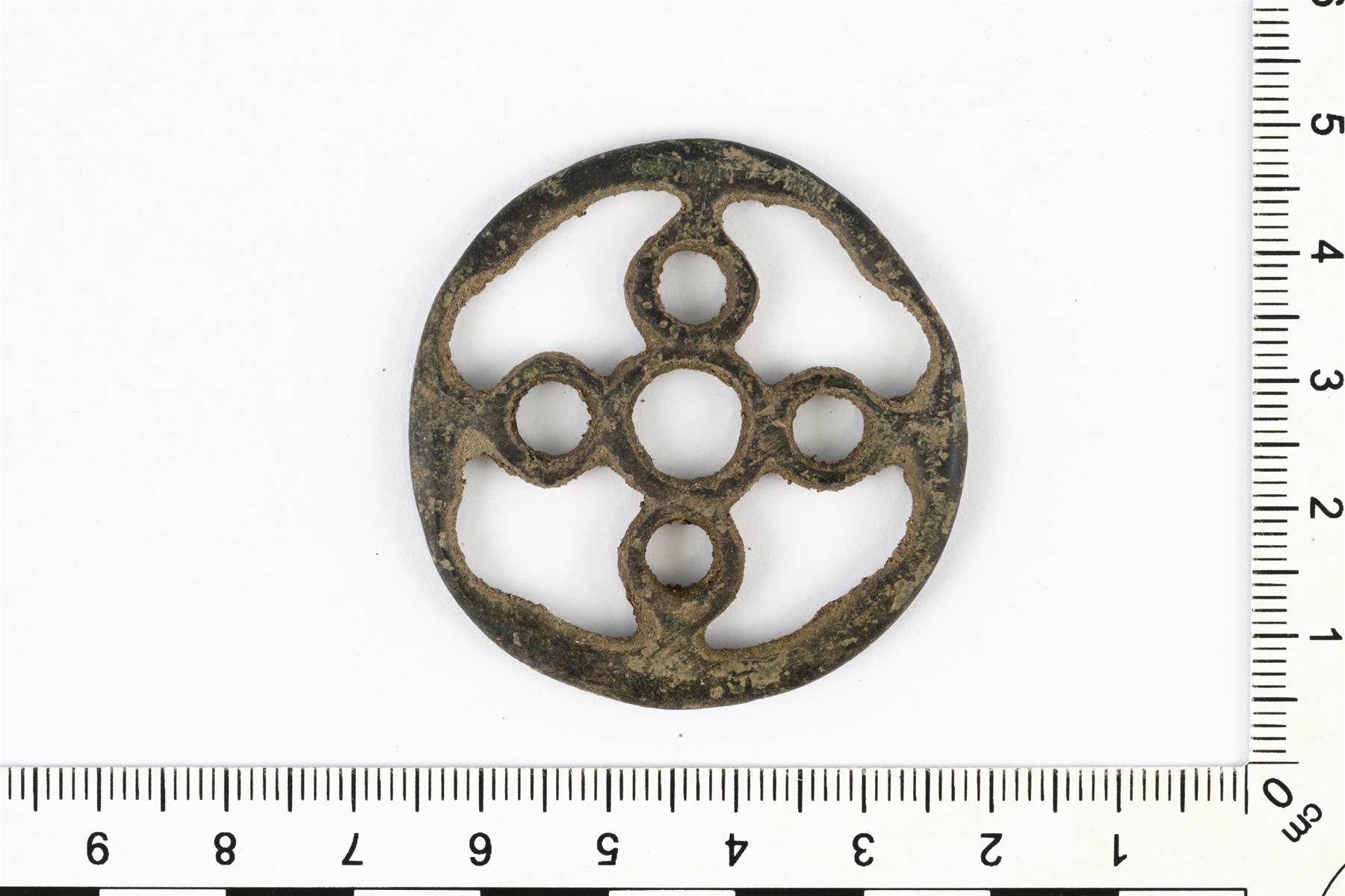 | Kehältä paikoin kulunut vyöllispyörä. Keskellä on yksi ympyräkehä ja sen ympärillä on neljä pienempää kehää. | |