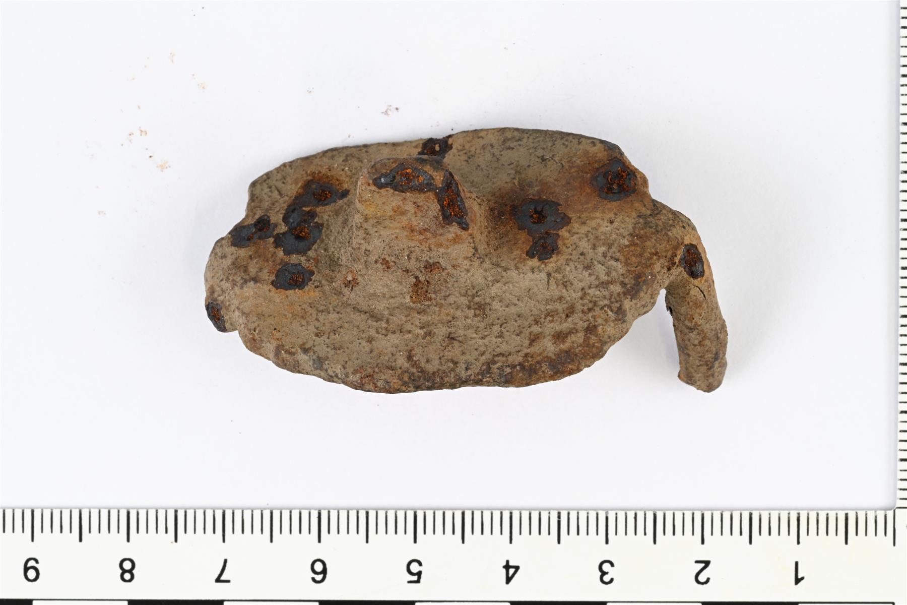 | Kaksipiikkinen viskari. Yksi piikeistä on hajonnut ja toisesta on säilynyt pala. Pohjalevy on muodoltaan ovaali. | |