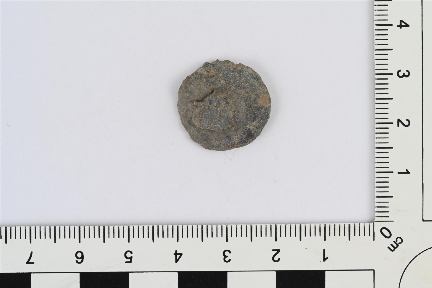 | Pyöreä lyijyplombi. Toisella pinnalla näkyvissä hieman leimakuviota. | |