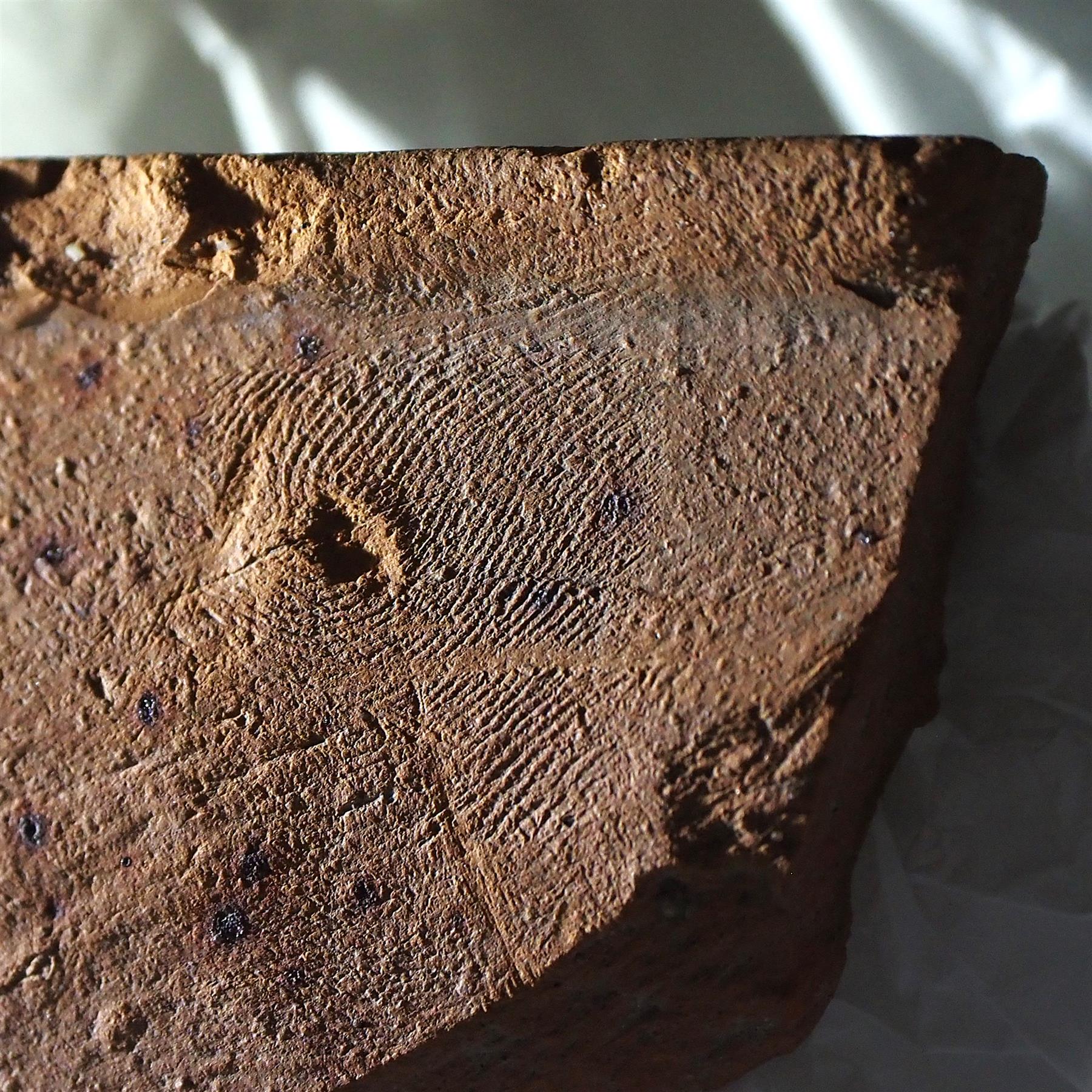 | Punasavisen kaakelin reuna. Voimakas profilointi, ulkopinnalla hieman rihlausta. Sisäpintaan painautunut sormenjälki. | |