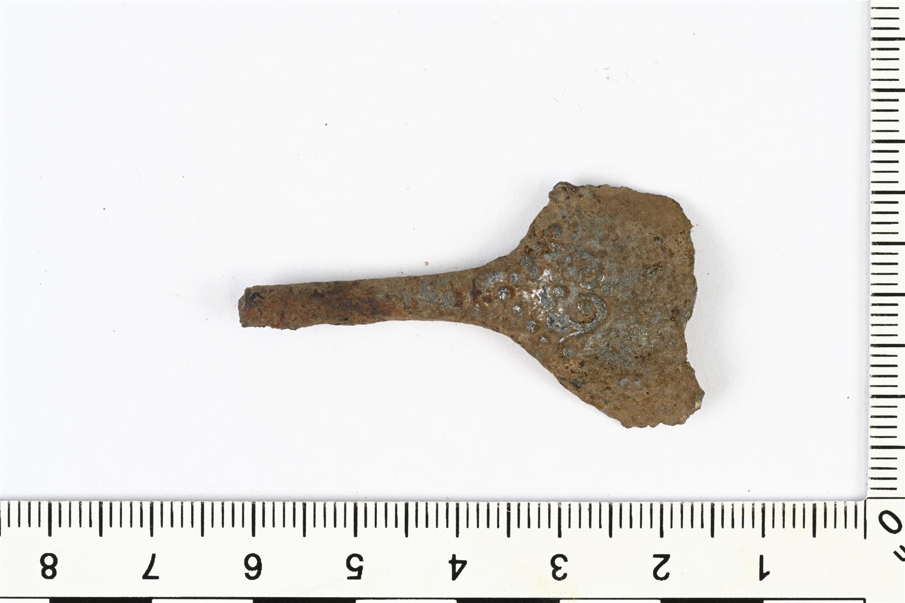 | Lusikan varren ja pesän tyviosan katkelma. Pesän taustapuolella on koristeluna kohopisteitä ja kasviornamentiikkaa. | |