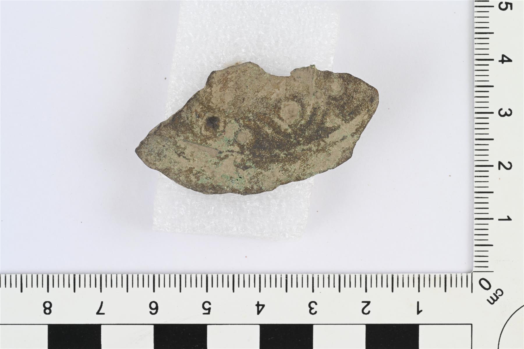 | Pyöreän kupurasoljen reunakatkelma. Luultavasti Appelgrenin tyyppiä D. Pieniä pyöreitä reikiä tai kuoppia ja etupuolella yksi matala tappi. Taustapuolella neulalaitteen katkelma. | |