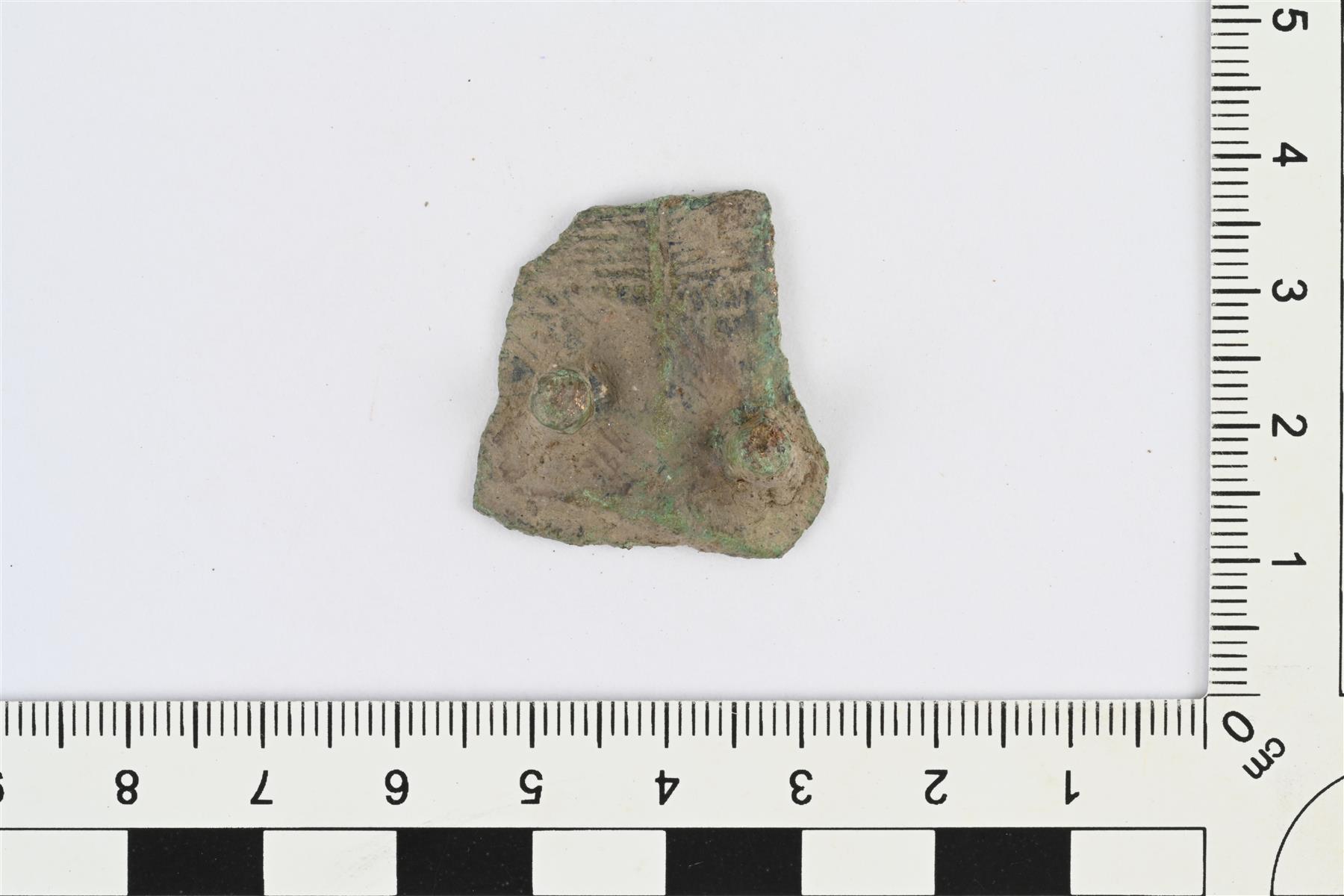 | Valmunuppisen kaarisoljen varsikatkelma. Etupuolella kaksi nuppia, esineen pituussuunnassa kulkeva kohovyö ja sen molemmin puolin tiheää poikkiviivoitusta. | |