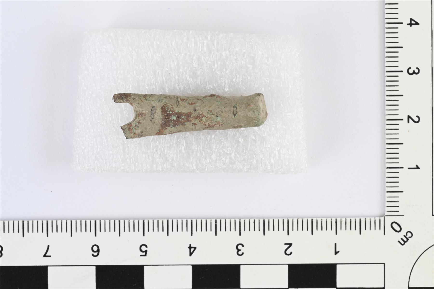 | Koruneulan kanta. Poikkileikkaus ovaali, toisesta päästä murtunut ripustuslenkki ja toisesta katkennut neula. | |