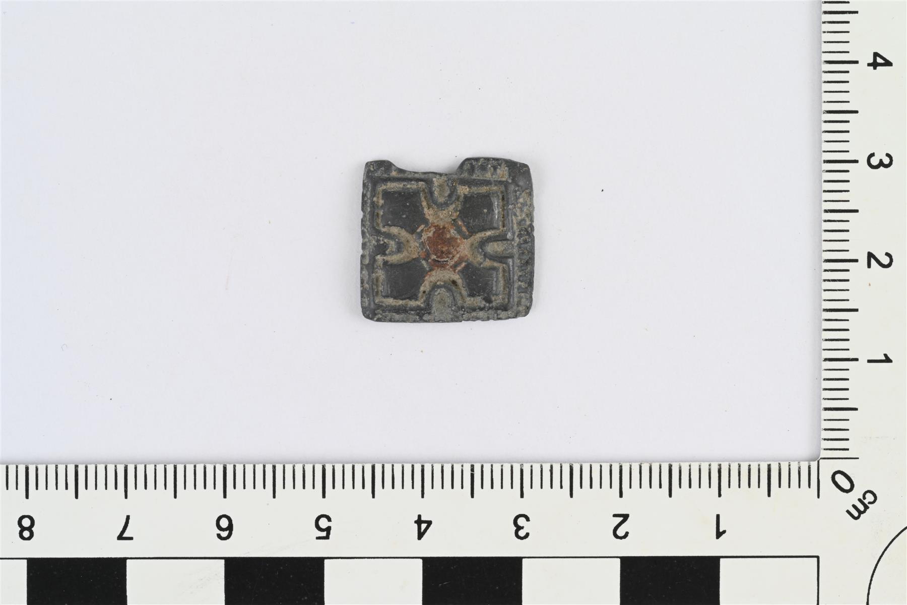 | Nelikulmainen vyönhela, ruusukehela. Etupuolella reliefikoristeluna vinoristi ja reunaa kiertävä poikkiviivainen koristeraita. Keskellä niitti, luultavasti rautaa. Reuna hieman murtunut. | |