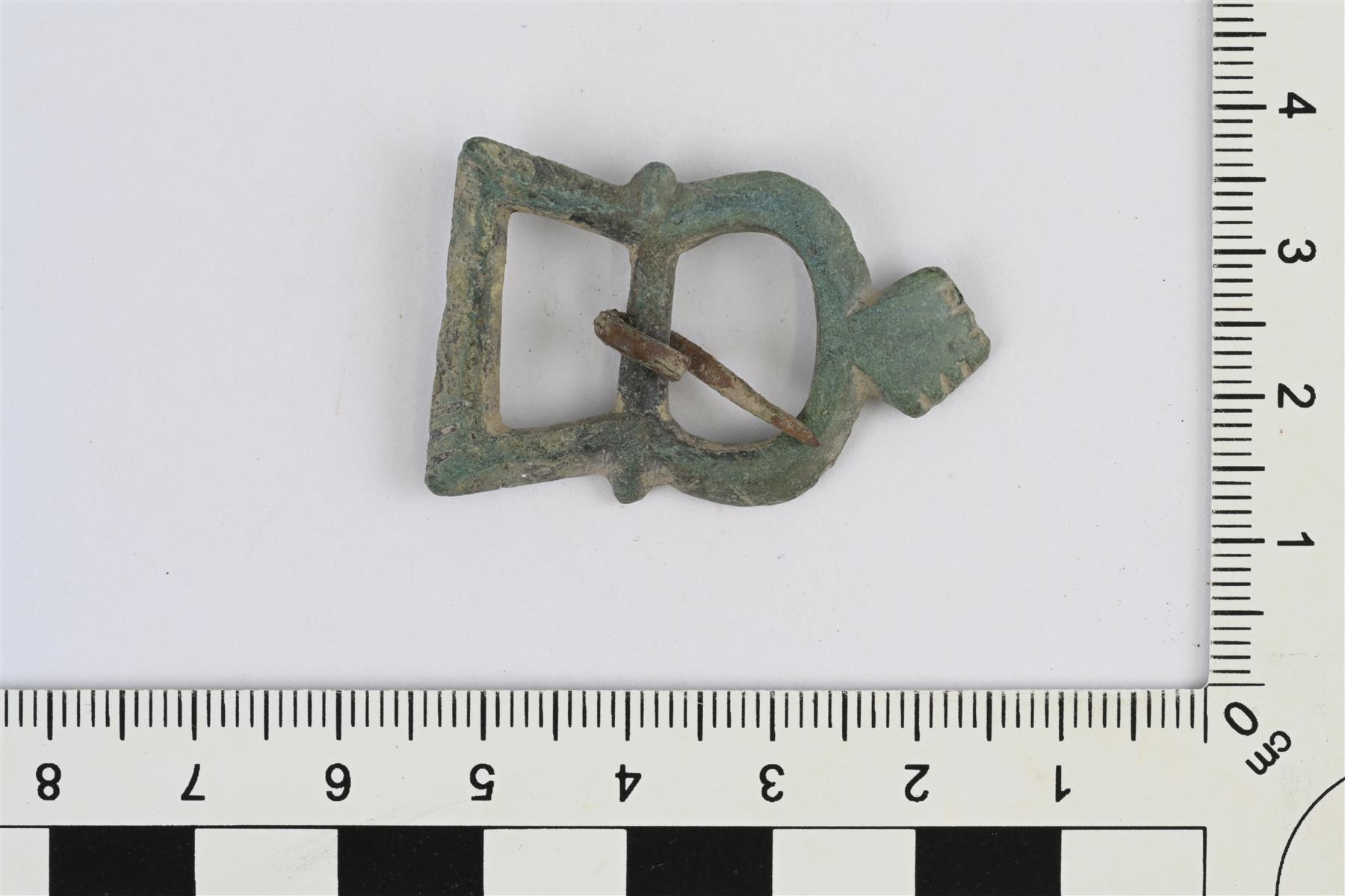 | Epäsymmetrinen double loop -solki. Kapein keskiakselin kohdalta, levenee päihin, keskiakselin päät ulkonevat kehän ulkopuolelle. Toinen puolikas puolisuunnikkaan muotoinen, toinen D-kirjaimen muotoinen ja siinä kaaren keskikohdassa vinoneliön muotoinen uloke, jonka reunassa poikkiviivakoristelua. Ohut neula, jonka tyvi kierretty keskiakselin ympärille. | |