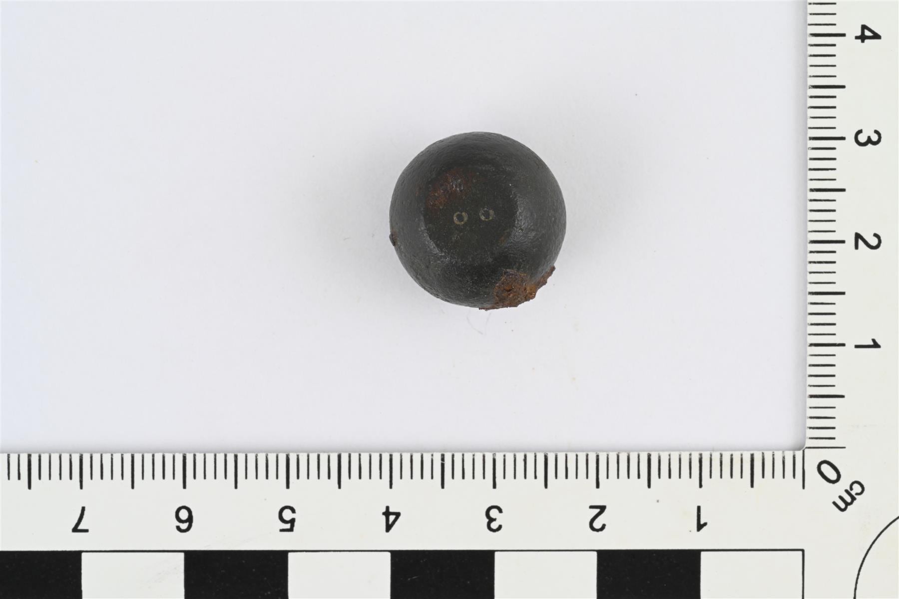 | Kuulamainen punnus. Kupariseosvaippa ja rautaydin. Raudan korroosio rikkonut hieman kupariseospintaa. Lakien halkaisija 9 mm, kummassakin kaksi pientä ympyräleimaa. | |