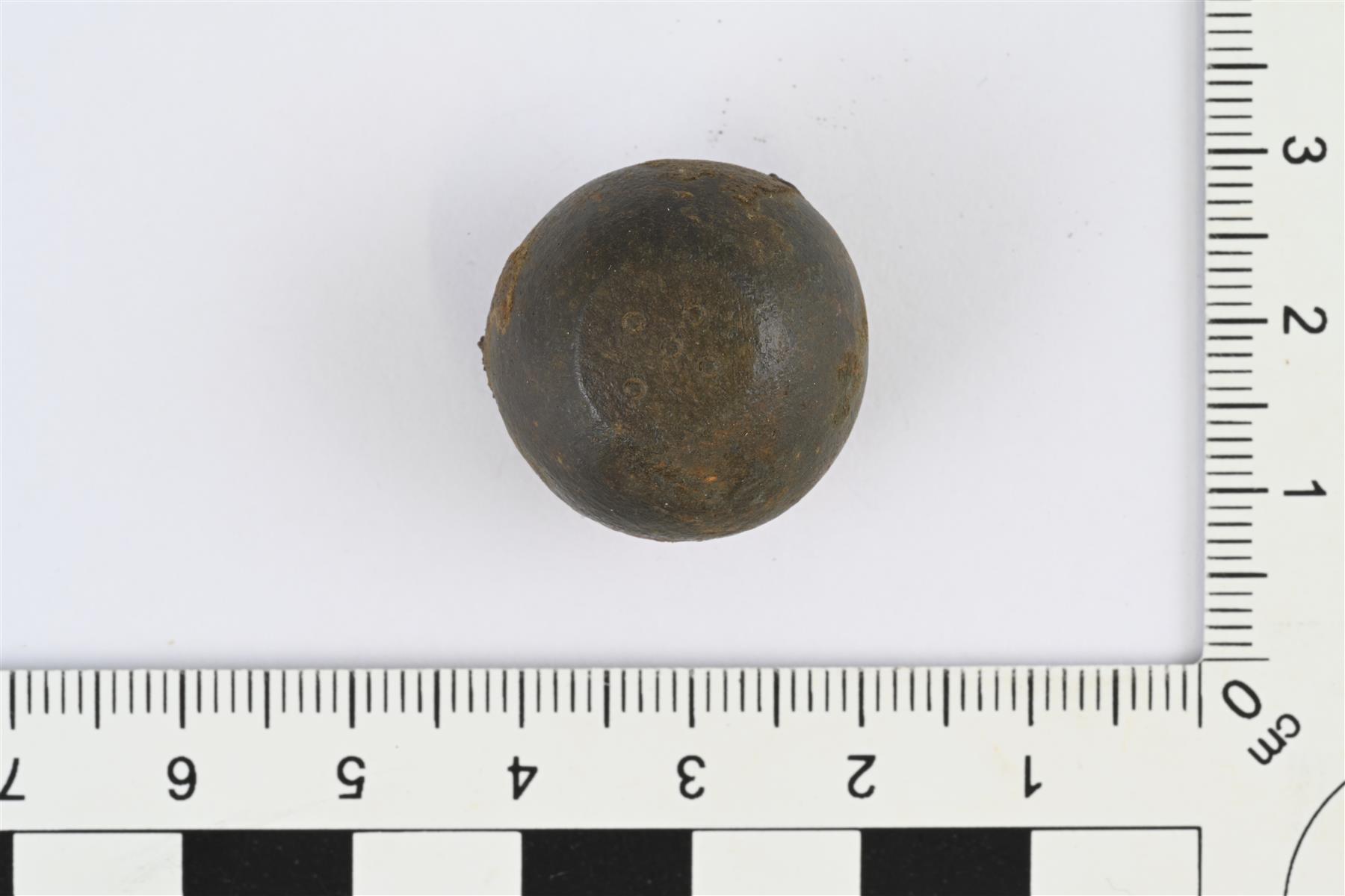 | Kuulamainen punnus. Kupariseosvaippa ja rautaydin. Raudan korroosio rikkonut hieman kupariseospintaa. Lakien halkaisija 11-12 mm, toisessa laessa viisi pientä ympyräleimaa. | |