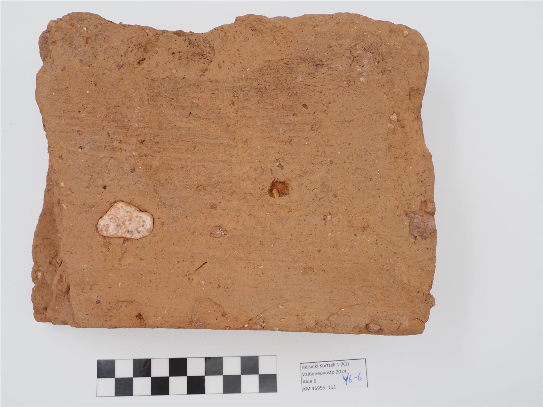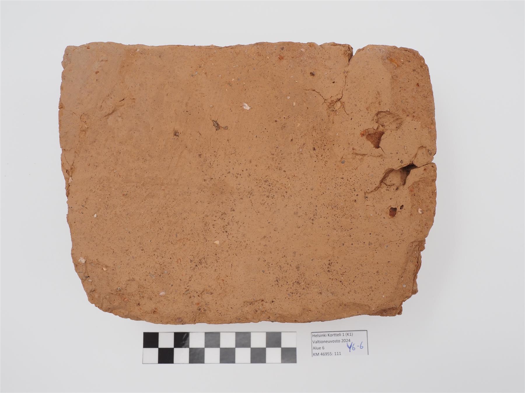 | Punasavisen tiilen puolikas. Vaaleanpunainen saviaines. Pinnoilla kuivauksen yhteydessä tulleita painaumia. | |