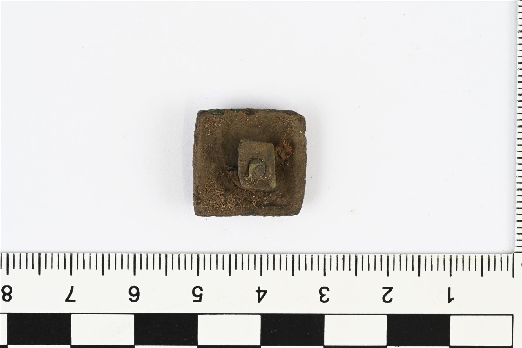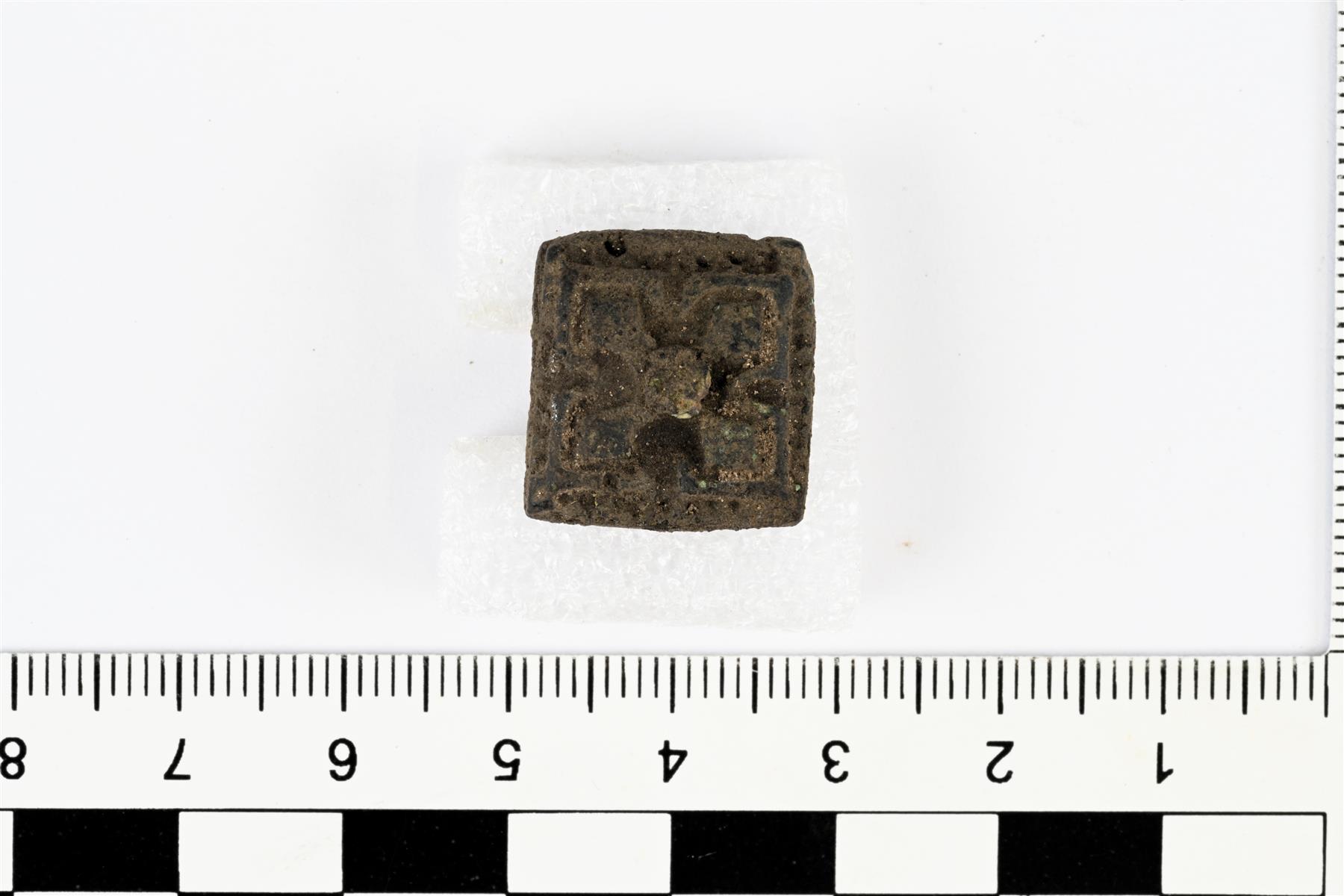 | Neliönmuotoinen ruusukehela. Säilynyt hyväkuntoisena. Etupuolella on koristeluna kohokuvioinen vinoristi ja reunoja kiertää viivauurteiden muodostama kenttä. Keskellä on reikä, jossa on säilyneenä niitti ja niitin varressa on neliönmuotoinen aluslevy. Vrt. Kivikoski Abb. 918 ja 1202. | |