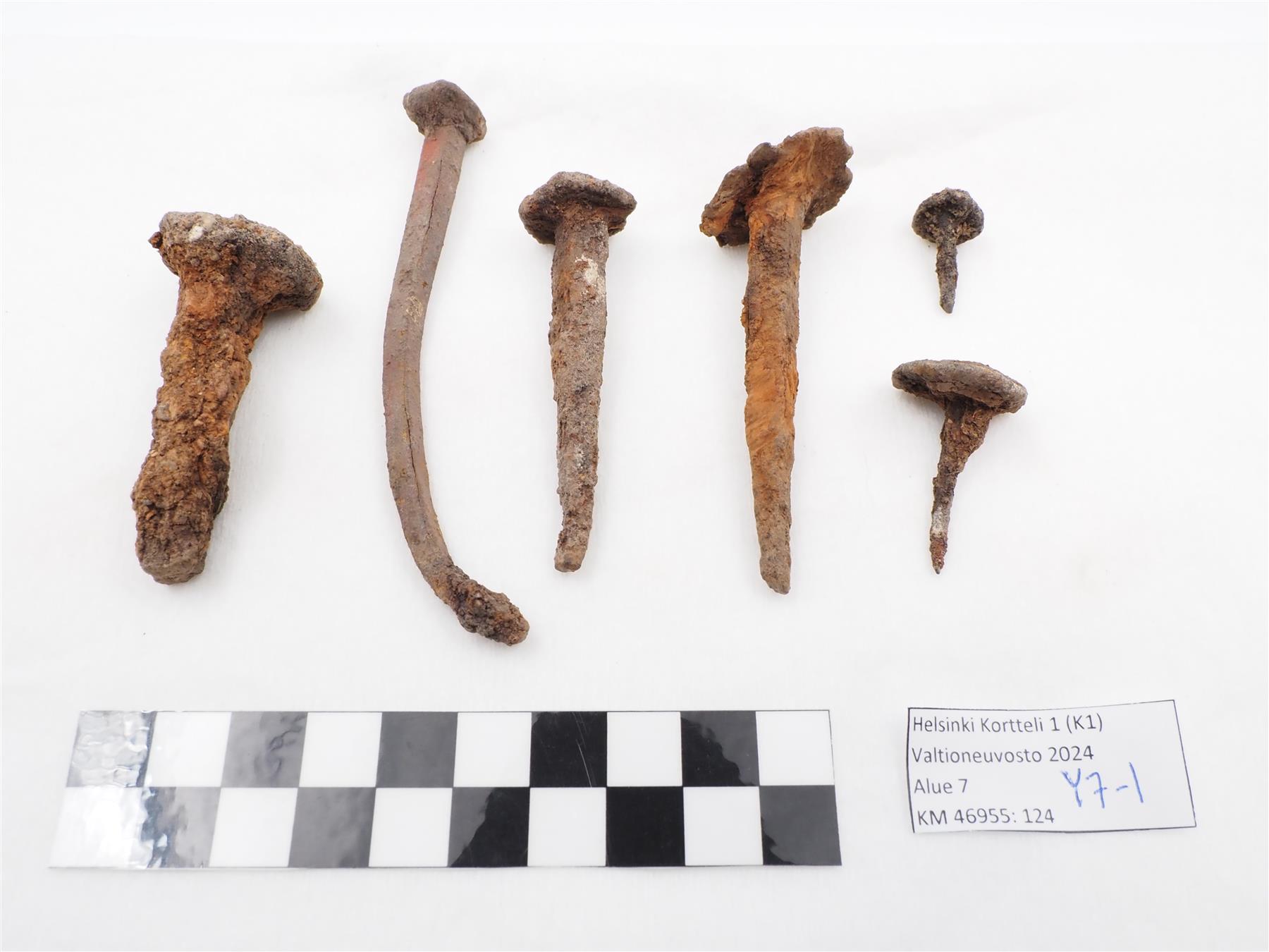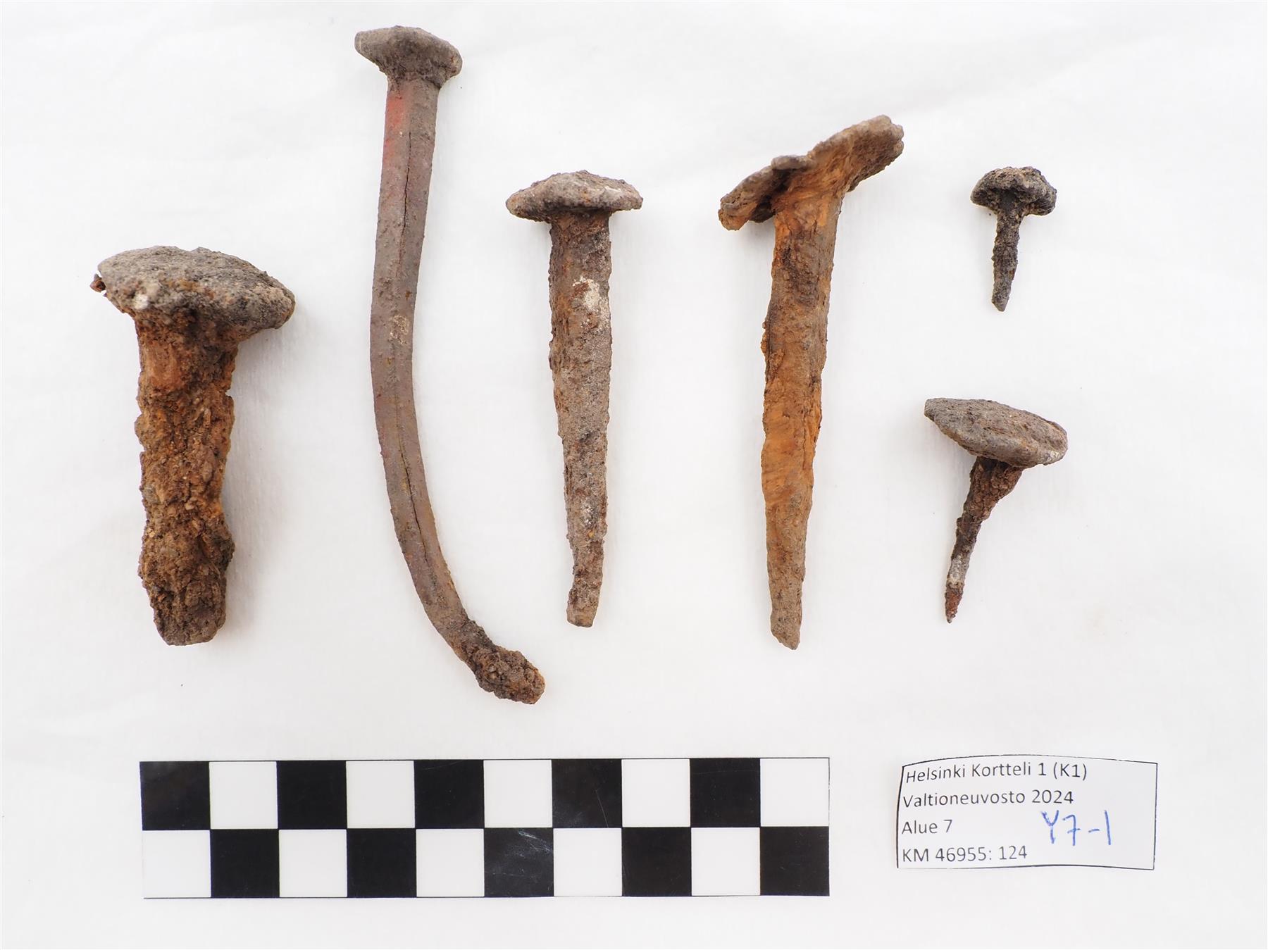 | 7 kappaletta erikokoisia ja -näköisiä rautanauloja, Näyte, loput naulat poistettu, ks. poistetut esineet. | |
