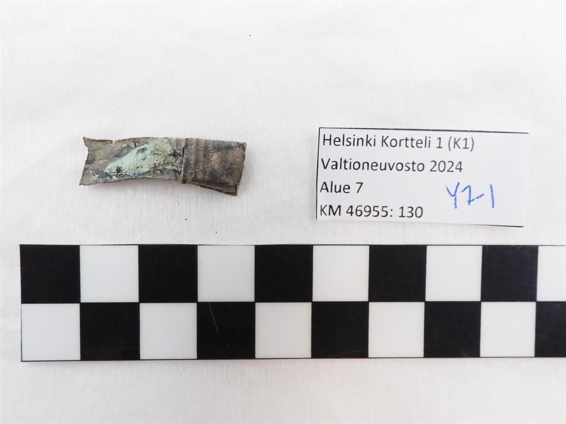 | Pienikokoisen hyvin ohuen kupariseoksesta valmistetun esineen katkelma. Toisessa päässä päälle taitettu osa. | |