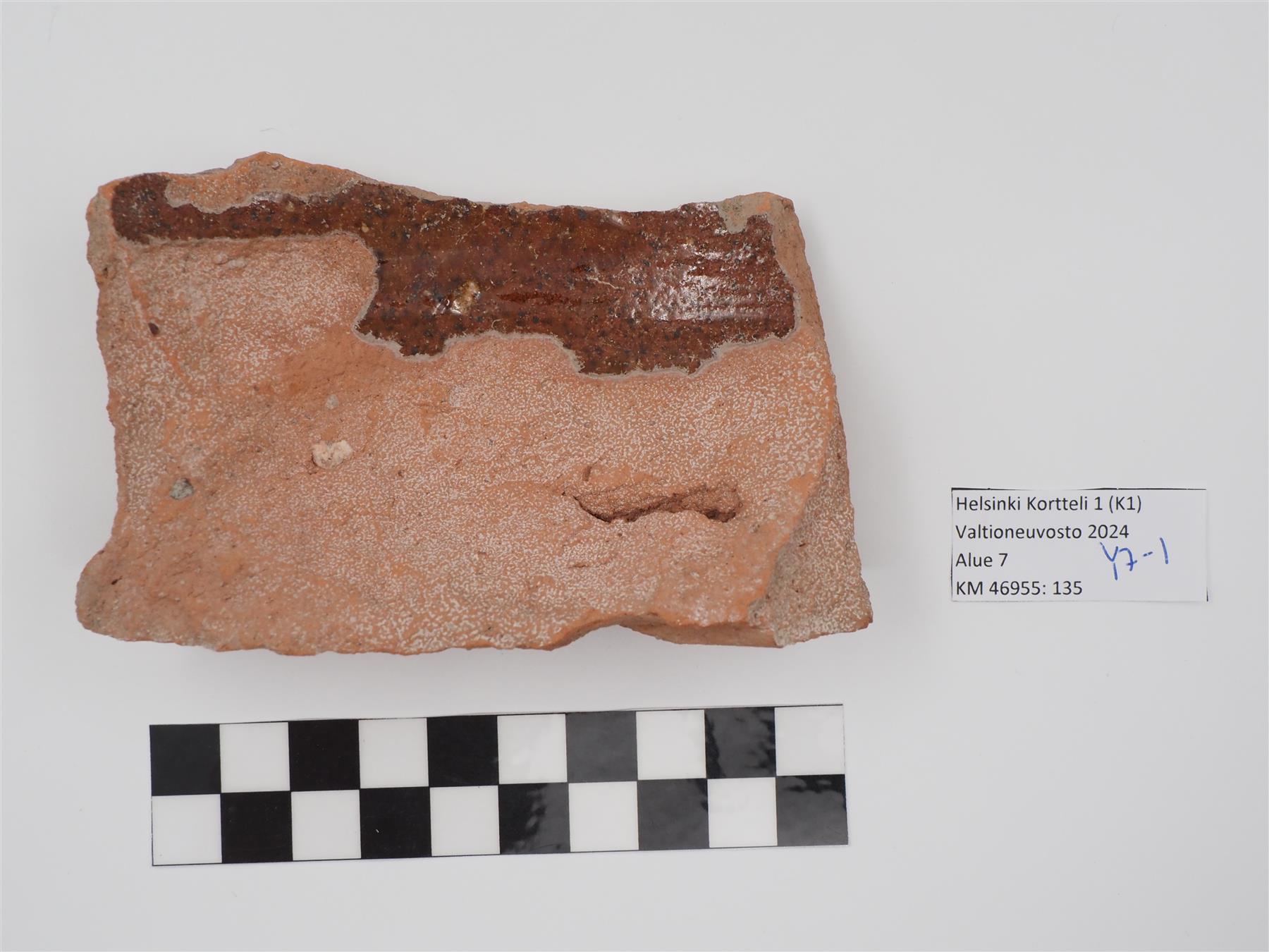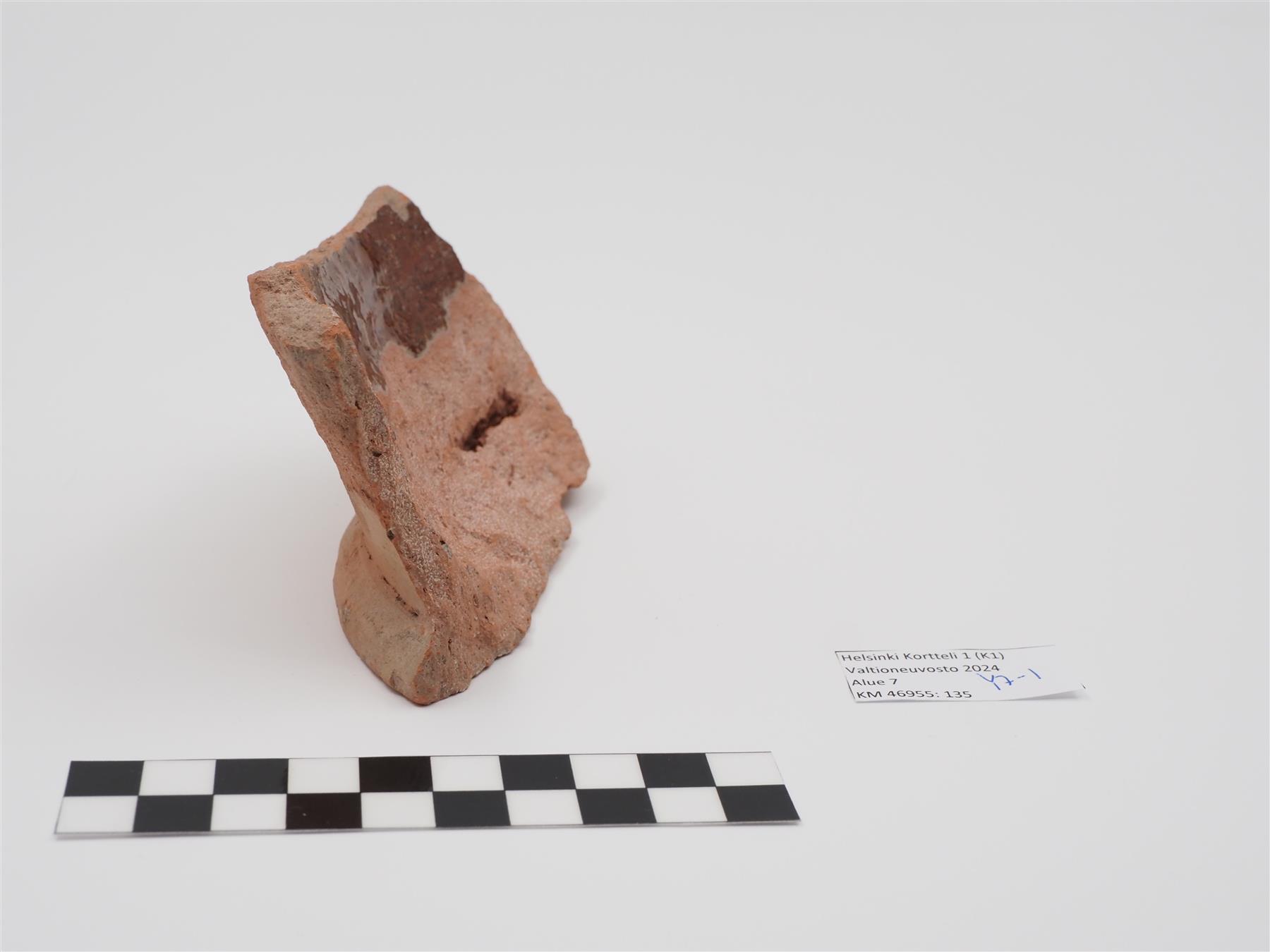 | Suurikokoisen punasavisen astian pohjareuna. Sisäpinta laajalti tuhoutunut, ehjässä osassa kulunutta ruskeaa lasitetta. Ulkopuolella hienoja dreijausjälkiä sekä osittain tuhoutunut sormenjälki. | |