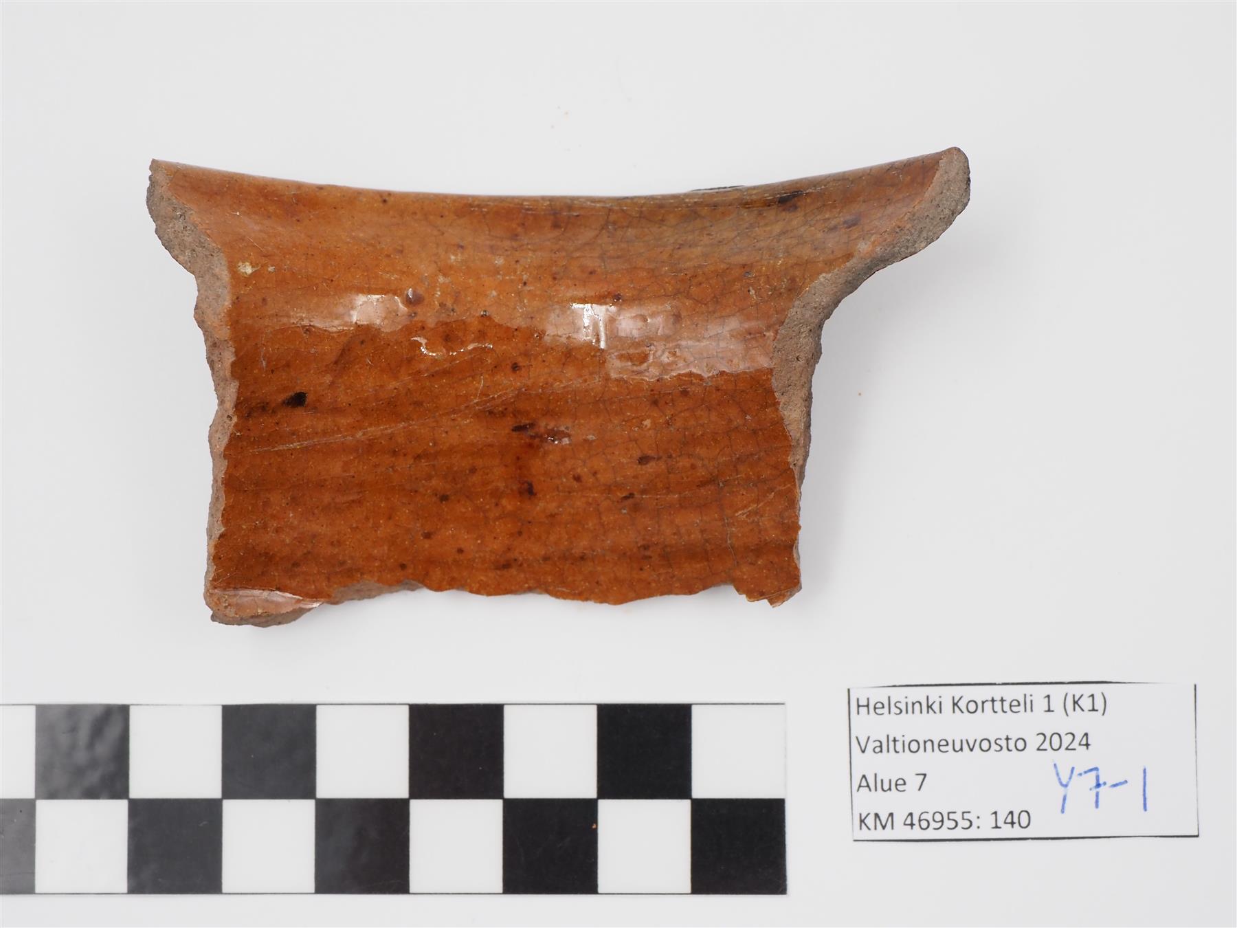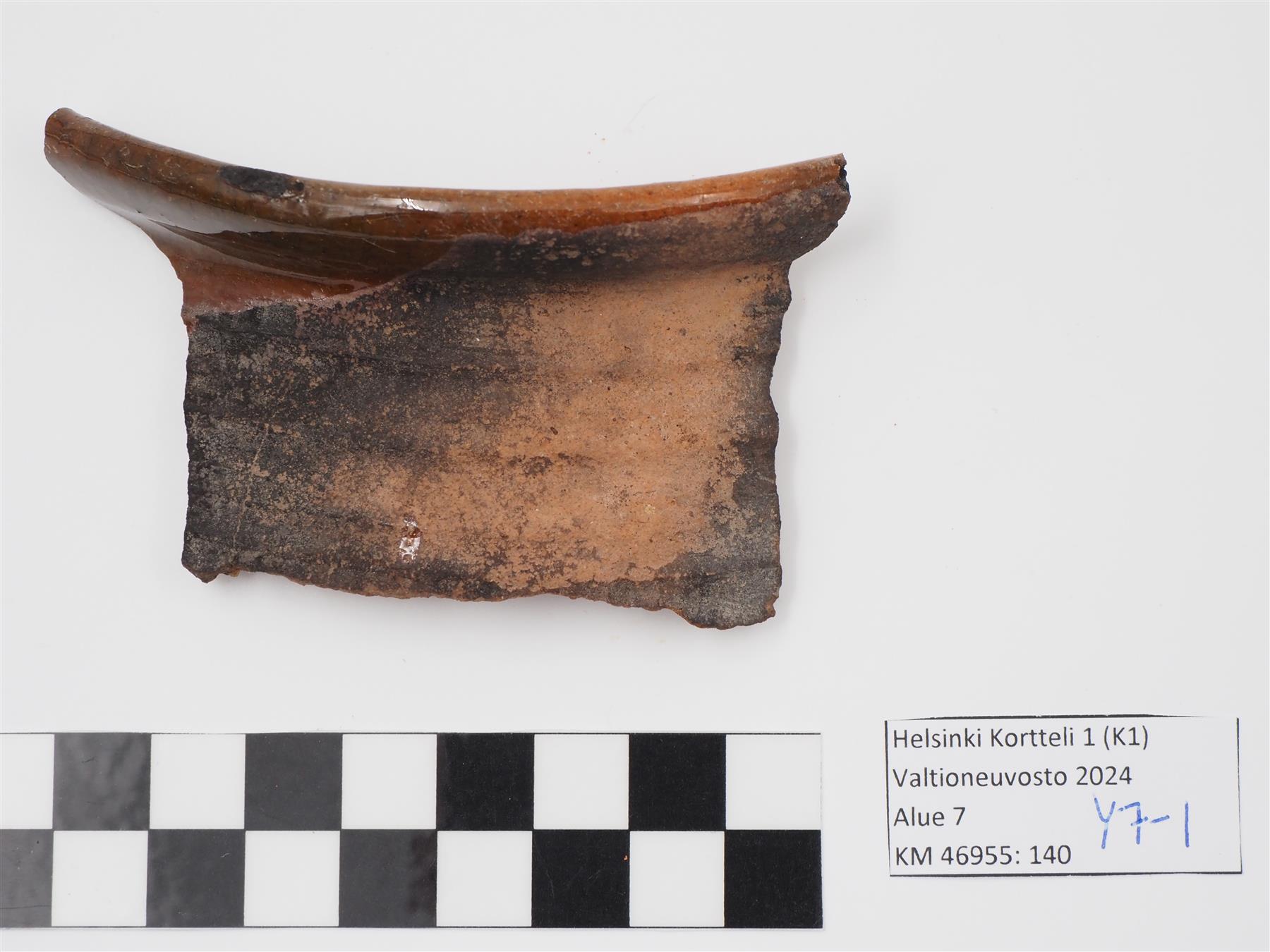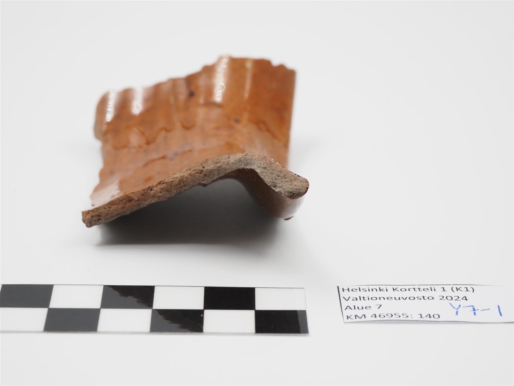 | Punasavisen astian suureuna. Reuna profiloitu. Sisäpinnalla vaaleanruskea lyijylasite, joka jatkuu hieman reunan yli ulkopinnalla. Ulkopinta muuten lasittamaton ja osittain nokeentunut. Kyljessä rihlausta, joka näkyy sekä sisä- että ulkopinnalle. | |