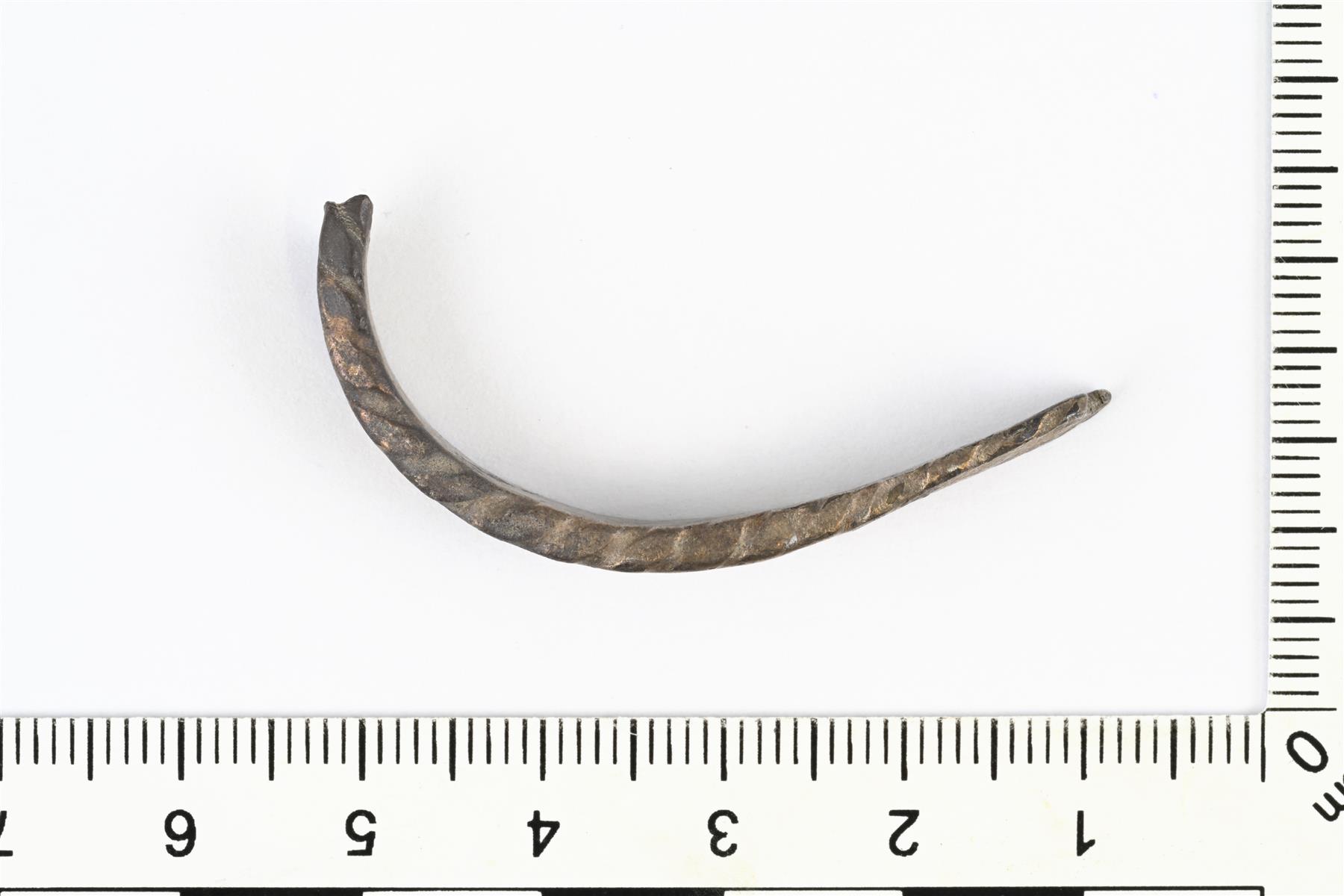 | Mahdollinen rannerenkaan tai maksuhopean katkelma. Poikkileikkaukseltaan neliömäinen. Kapeilla reunoilla on koristeluna vinoviivoja. Samantyylinen koristelutapa on Nakkilan Penttalan spiraalirannerenkaassa (Salo Taf. 34: 8), jonka perusteella löytö voi ajoittua varhaisrautakaudelle. | |