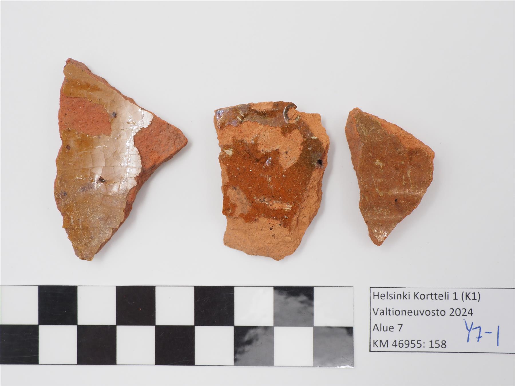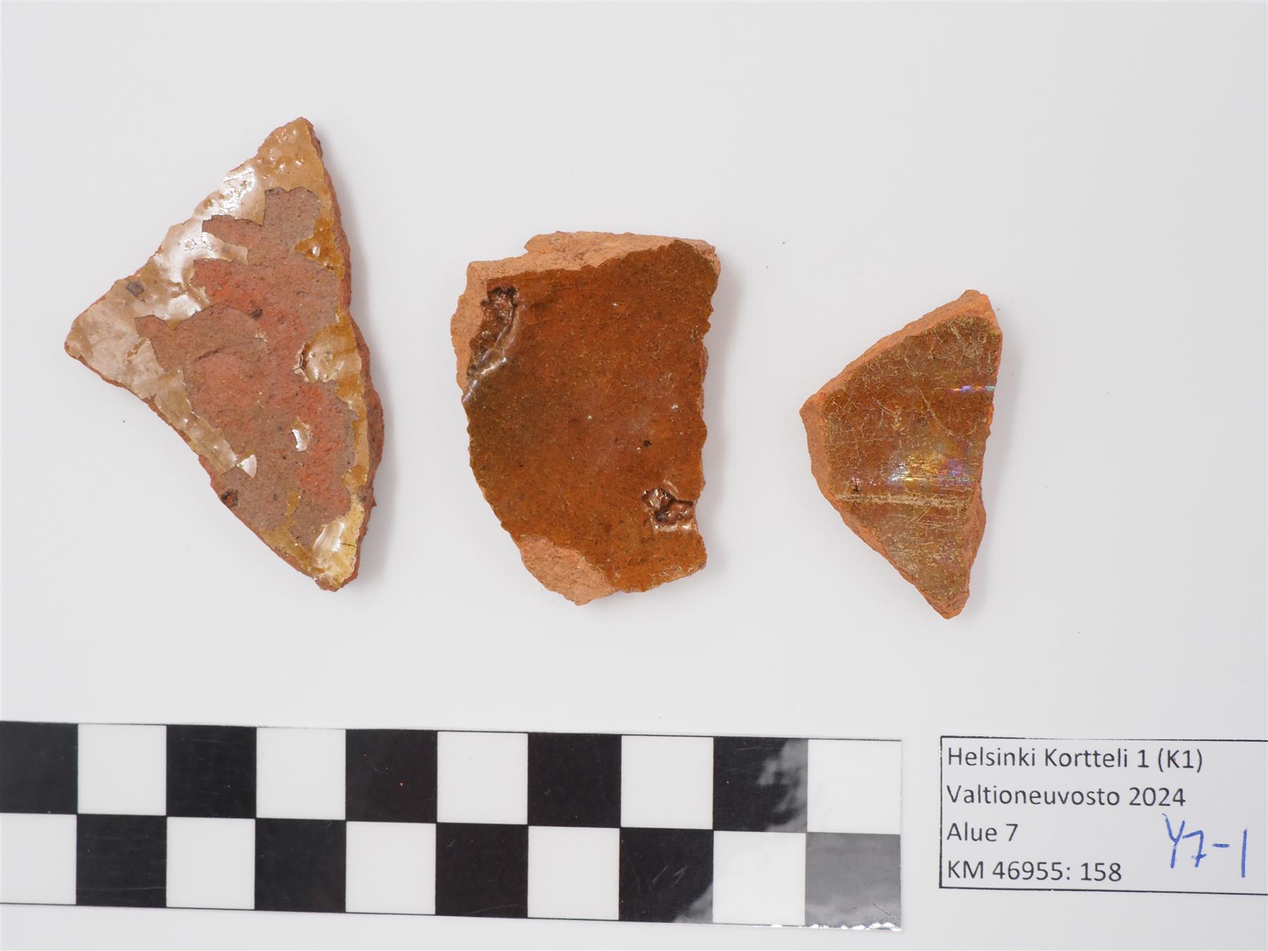 | 3 kpl punasaviastian paloja, todennäköisesti samasta astiasta. Molemmilla pinnoilla keltaruskea lasite. | |