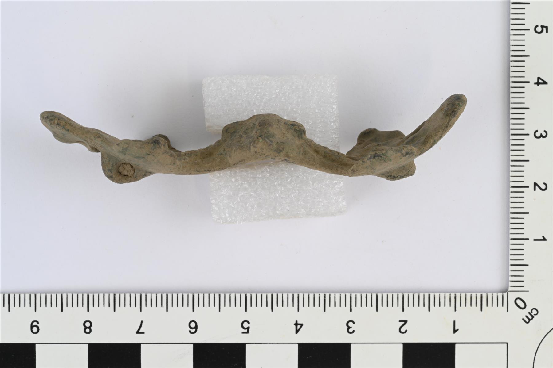| Tasavartinen solki. Neula puuttuu, muuten ehjä. Vastaa Kivikosken tyyppiä 7. Etupuolella viiva- ja tappikoristelua. | |