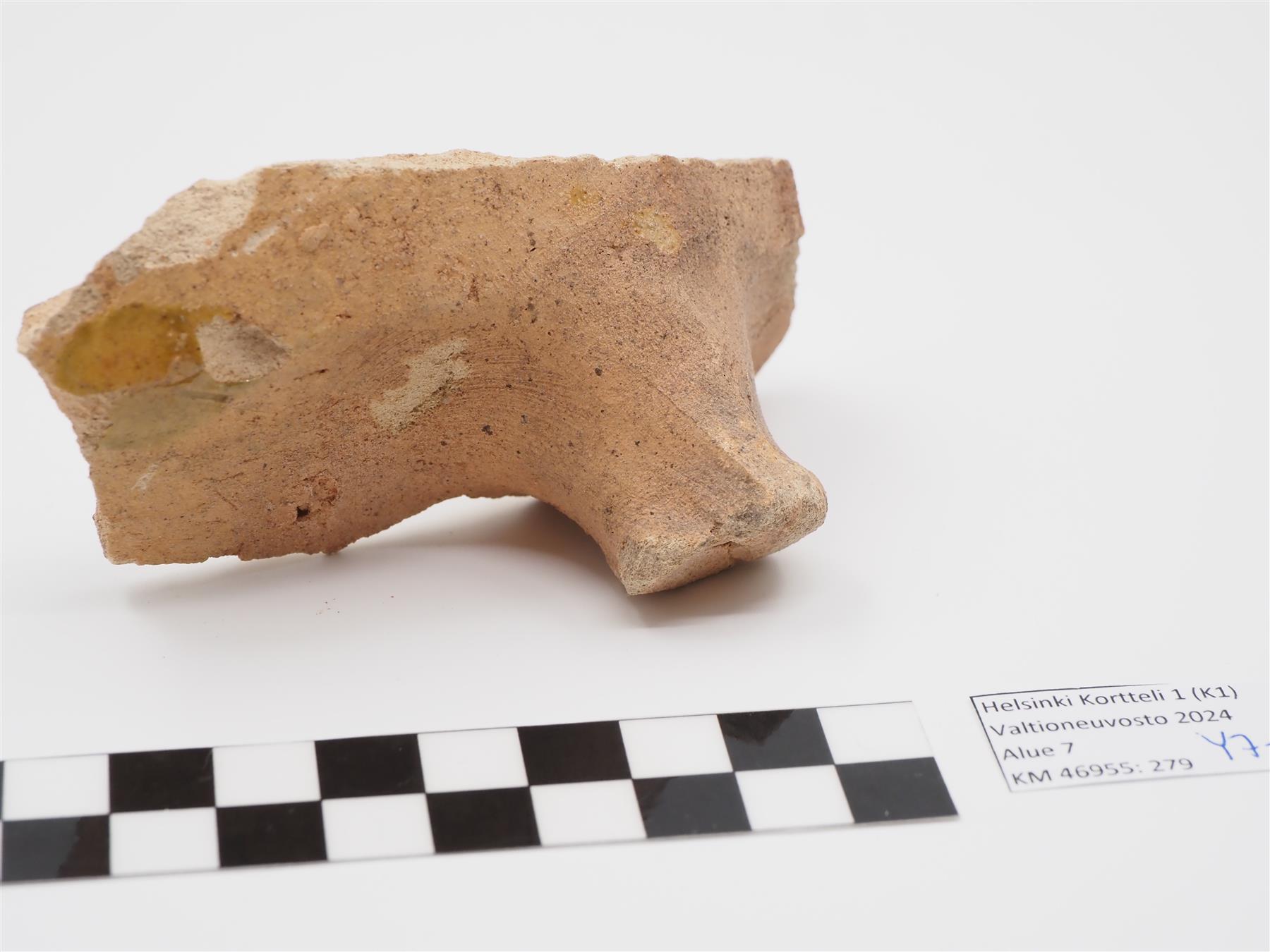 | Valkosaviastian kylkipala ja jalka. Sisäpinnalla vihreä lyijylasite. Ulkopinta pääosin lasittamaton, reunassa hieman keltavihreää lasitetta. | |