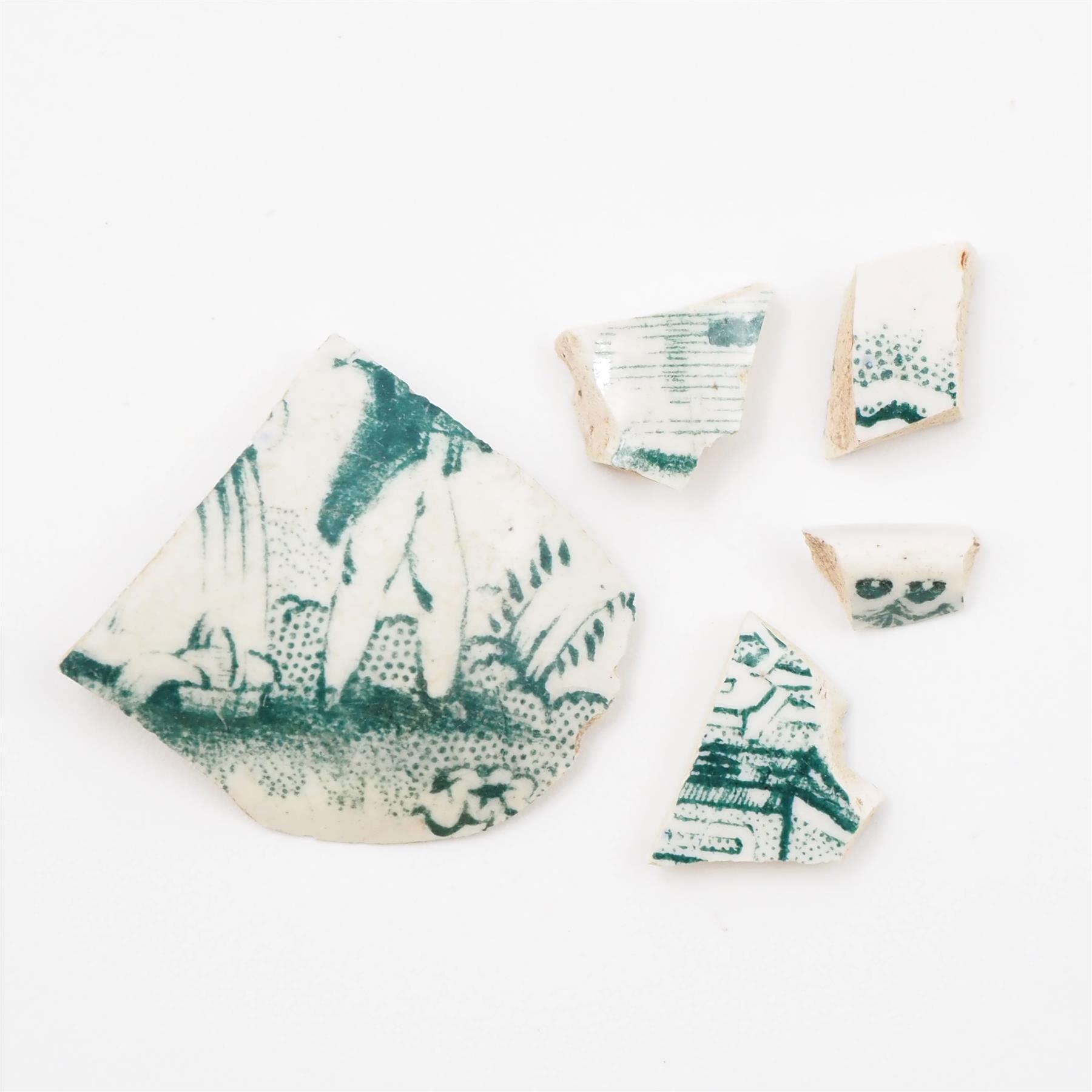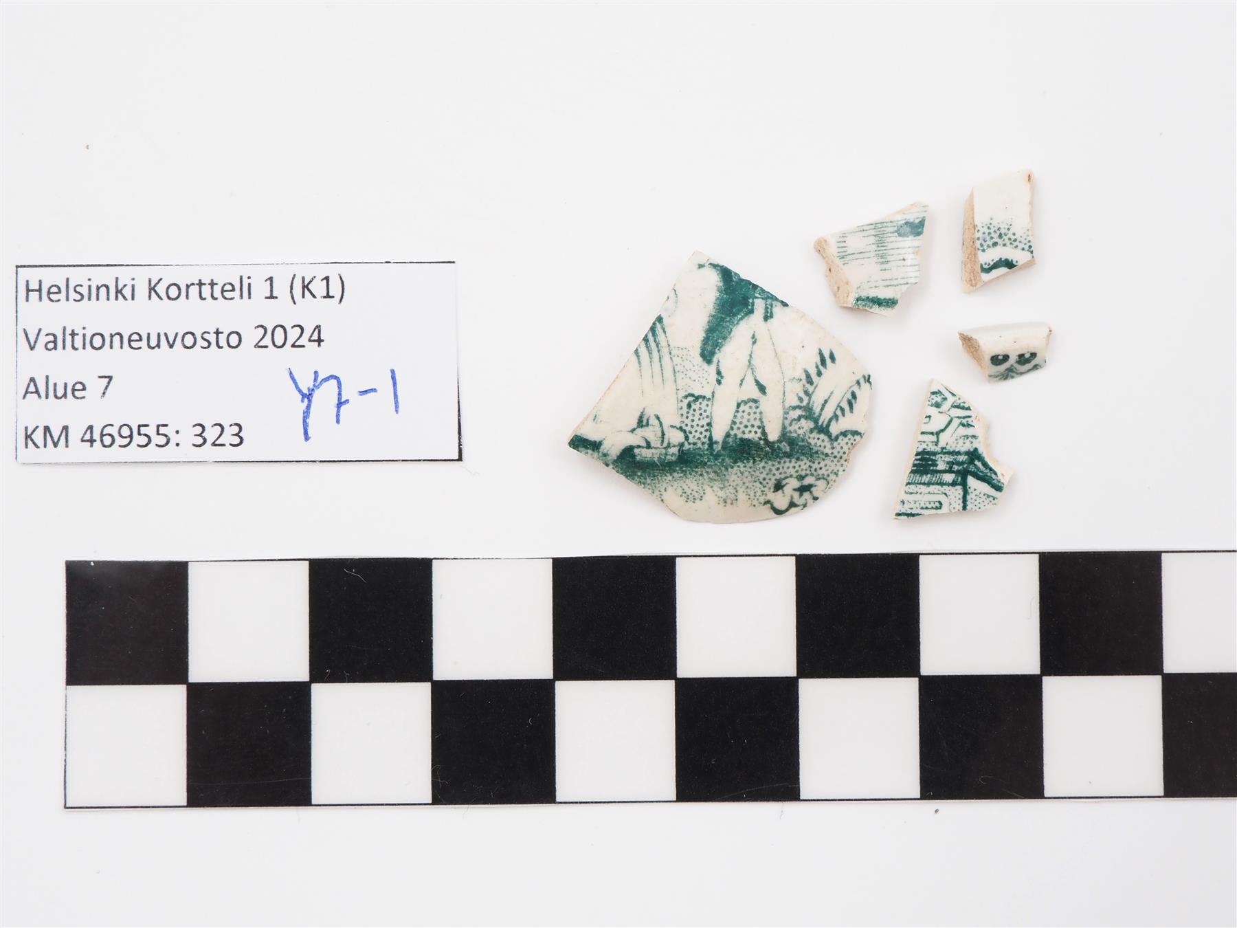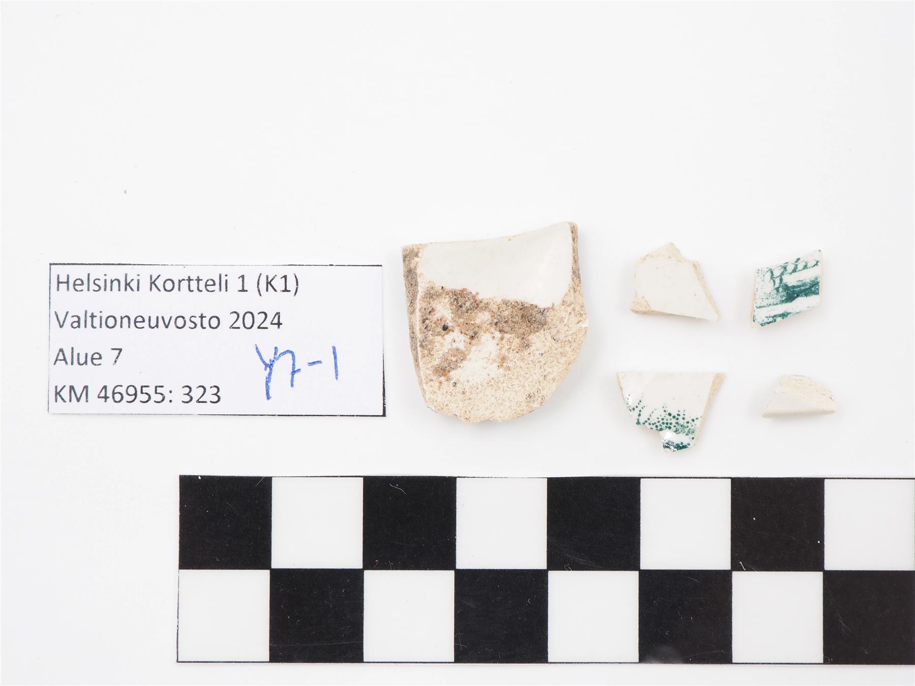 | 5 kpl piiposliiniastian paloja. Pinnoilla valkoinen tinalasite, jossa vihreää siirtokoristelua. Isoimman palan ulkopinnan koristelussa nähtävissä hännystakkiin pukeutuneen miehen alaruumis, eväskori sekä kasvillisuutta. | |