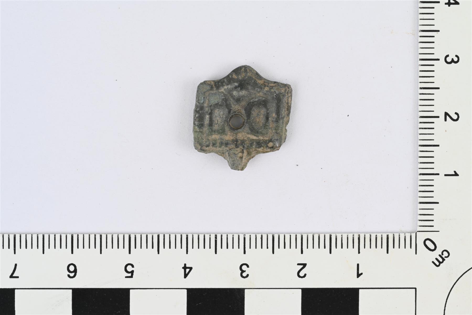 | Pieni suorakaiteenmuotoinen hela, jonka pitkät sivut venyvät kolmiomaisiksi. Reliefikoristelua, keskellä reikä. | |