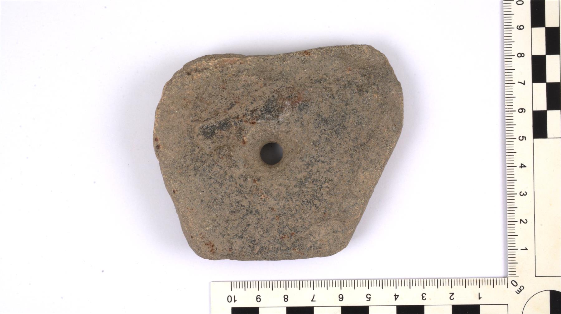 | Epäsäännöllinen reikäkivi. Keskellä on pieni reikä, joka on kairattu kummaltakin puolelta (tiimalasinmuotoinen). | |