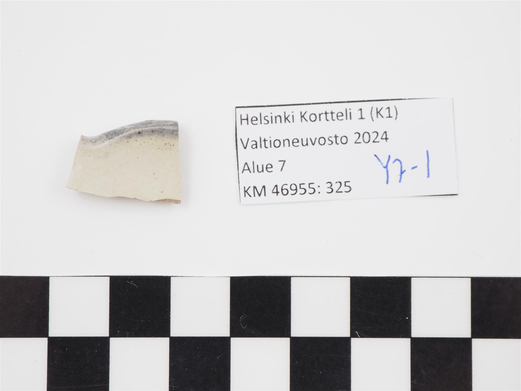 | Aaltoreunaisen astian reunapala. Molemmilla pinnoilla valkoinen tinalasite, reunan päällä harmaa lasite. | |