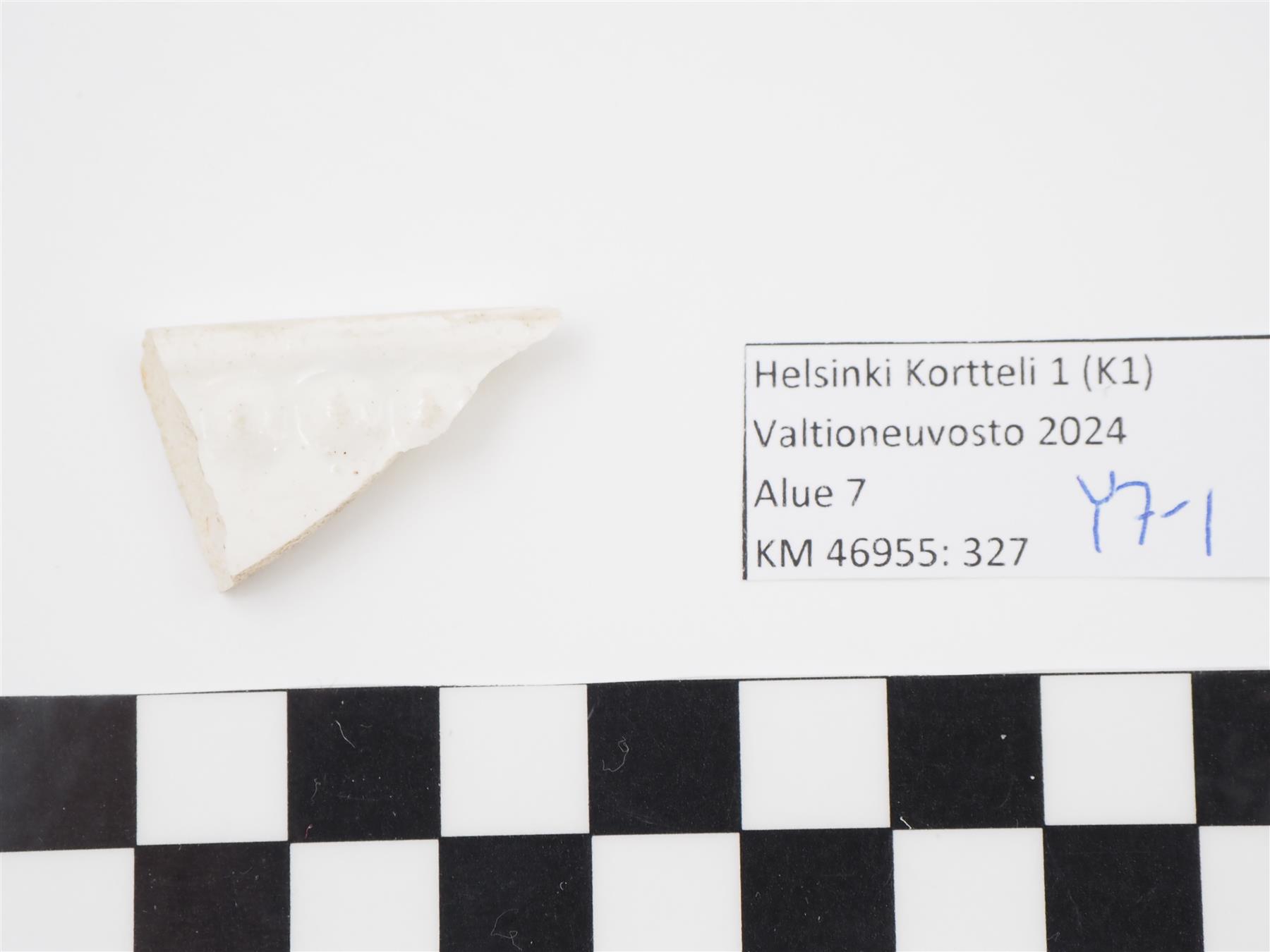 | Pieni piiposliinisen astian reunapala. Molemmilla pinnoilla valkoinen tinalasite, sisäpinnalla kohokuviointia. | |