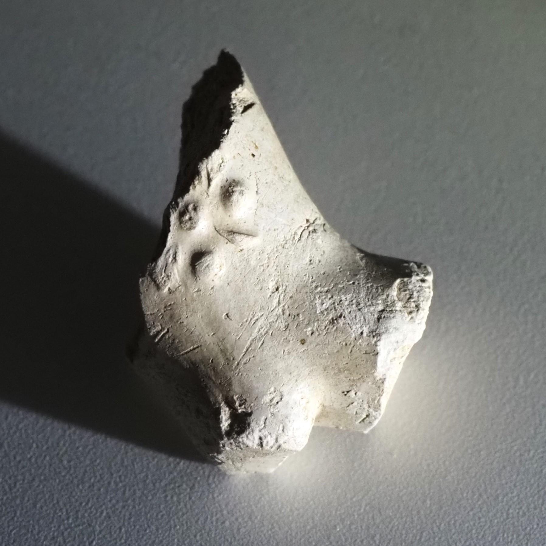 | Liitupiipun kanta ja hieman kylkeä. Kyljen alaosassa molemmilla puolilla osa osittain hajonneesta kohokuvioidusta tudor-ruususta, jossa on neljä terälehteä sekä viivamaiset verholehdet niiden välissä. | |