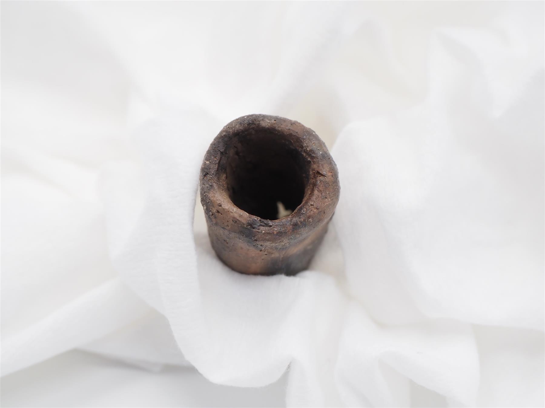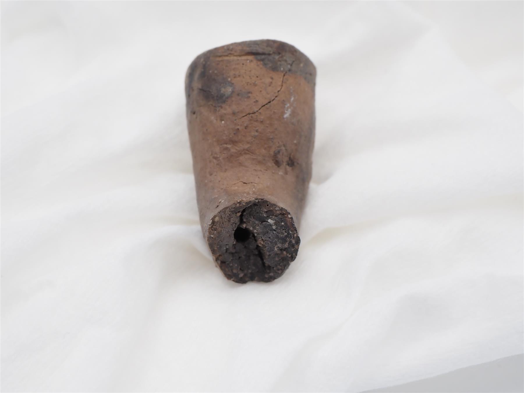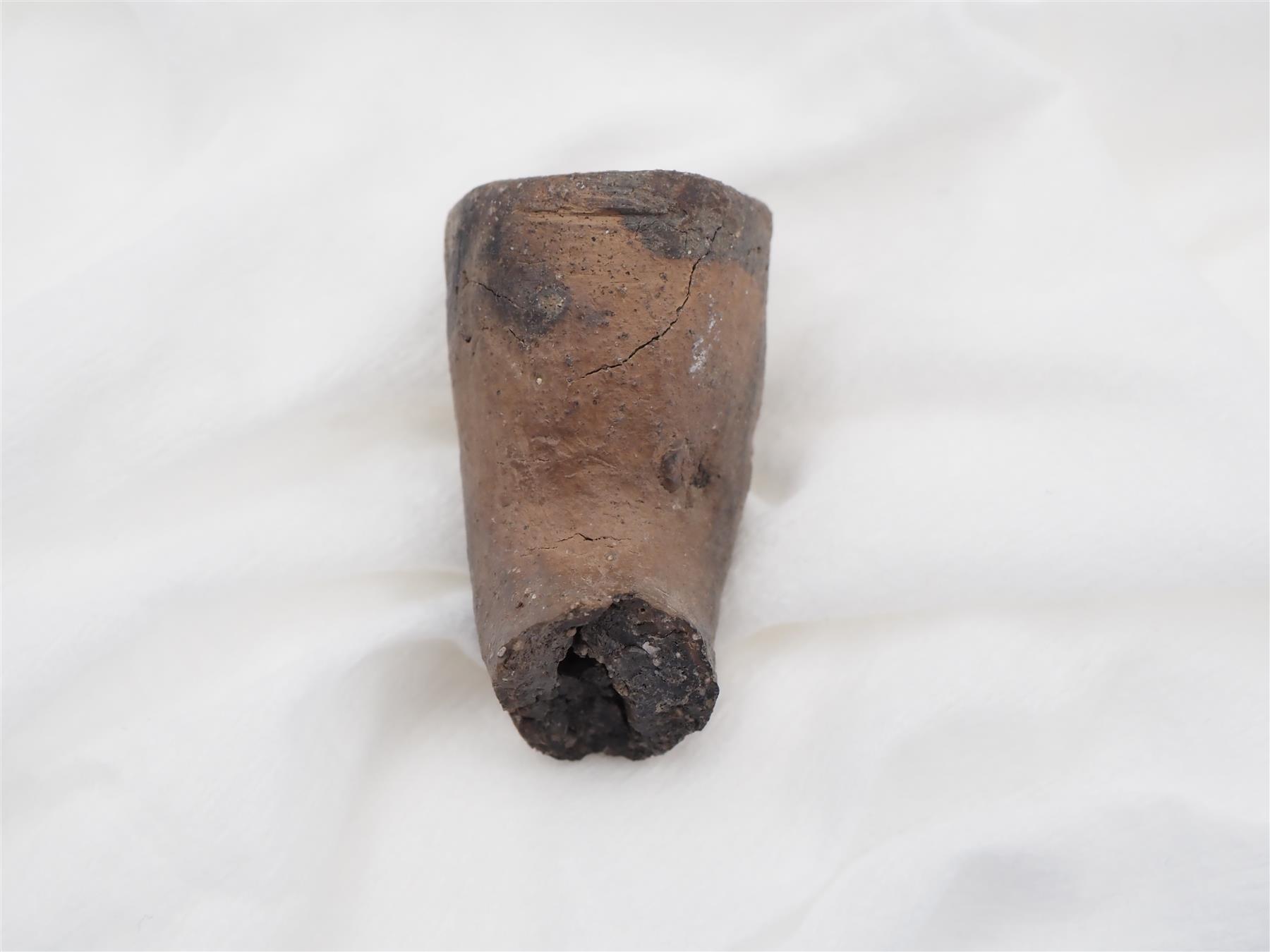 | Käsinmuotoillun punasavisen liitupiipun koppa. Pinta nokeentunut. | |